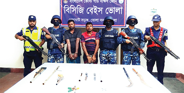 ভোলায় কোস্ট গার্ড ও পুলিশের যৌথ অভিযানে দুর্ধর্ষ ডাকাত সিরাজ বাহিনীর দুই সদস্যকে আটক করা হয়েছে। এসময় তিনটি দেশীয় আগ্নেয়াস্ত্র, অস্ত্র তৈরির সরঞ্জাম, চার রাউন্ড তাজা গোলা, পাঁচ রাউন্ড কার্তুজ এবং দুটি দেশীয় অস্ত্র উদ্ধার করা হয়। আটককৃতরা হলেন, মো. শহীদ (৪৮) ও মো. শাহাবুদ্দিন (৪৫)। তারা ভোলা জেলার দৌলতখান উপজেলার দক্ষিণ জয়নগর ইউনিয়নের পশ্চিম জয়নগর গ্রামের ৪ নম্বর ওয়ার্ডের বাসিন্দা। দৌলতখান উপজেলার খয়েরহাট বাজার সংলগ্ন এলাকায় অভিযান চালিয়ে তাদের আটক করা হয়। গত সোমবার দিবাগত রাত ১টা থেকে গতকাল মঙ্গলবার ভোর ৫ পর্যন্ত অভিযান চলে। গতকাল মঙ্গলবার সকালে কোস্ট গার্ড ভোলার দক্ষিণ জোনের মিডিয়া কর্মকর্তা লেফটেন্যান্ট কমান্ডার হারুন-অর-রশীদ এ তথ্য জানান। কোস্ট গার্ড জানায়, গোপন সংবাদের ভিত্তিতে গতকাল রাত ১টা থেকে ভোর ৫টা পর্যন্ত কোস্ট গার্ড দক্ষিণ জোন ও পুলিশের সমন্বয়ে ভোলার দৌলতখান উপজেলার খয়েরহাট বাজারসংলগ্ন এলাকায় একটি যৌথ অভিযান চালানো হয়। এসময় ওই এলাকা থেকে দুটি বাড়ি তল্লাশি করে অস্ত্র তৈরির কারিগর ও দুর্ধর্ষ ডাকাত সিরাজ বাহিনীর দুই সদস্যকে অস্ত্রসহ আটক করা হয়। কোস্ট গার্ড দক্ষিণ জোনের মিডিয়া কর্মকর্তা লেফটেন্যান্ট কমান্ডার হারুন-অর-রশীদ জানান, জব্দকৃত অস্ত্র ও গোলাবারুদসহ আটক ডাকাতদের পরবর্তী আইনানুগ ব্যবস্থা গ্রহণের জন্য দৌলতখান থানায় হস্তান্তরের কার্যক্রম প্রক্রিয়াধীন রয়েছে। তিনি বলেন, দেশের আইনশৃঙ্খলা পরিস্থিতি স্থিতিশীল রাখতে বাংলাদেশ কোস্ট গার্ড ২৪ ঘণ্টা টহল জারি রেখেছে। এর মাধ্যমে কোস্ট গার্ডের আওতাধীন এলাকার আইনশৃঙ্খলা পরিস্থিতি অনেকাংশে উন্নত হয়েছে। কোস্ট গার্ড ভবিষ্যতেও এ ধরনের অভিযান অব্যাহত রাখবে। সূত্র: সংবাদ বিজ্ঞপ্তি