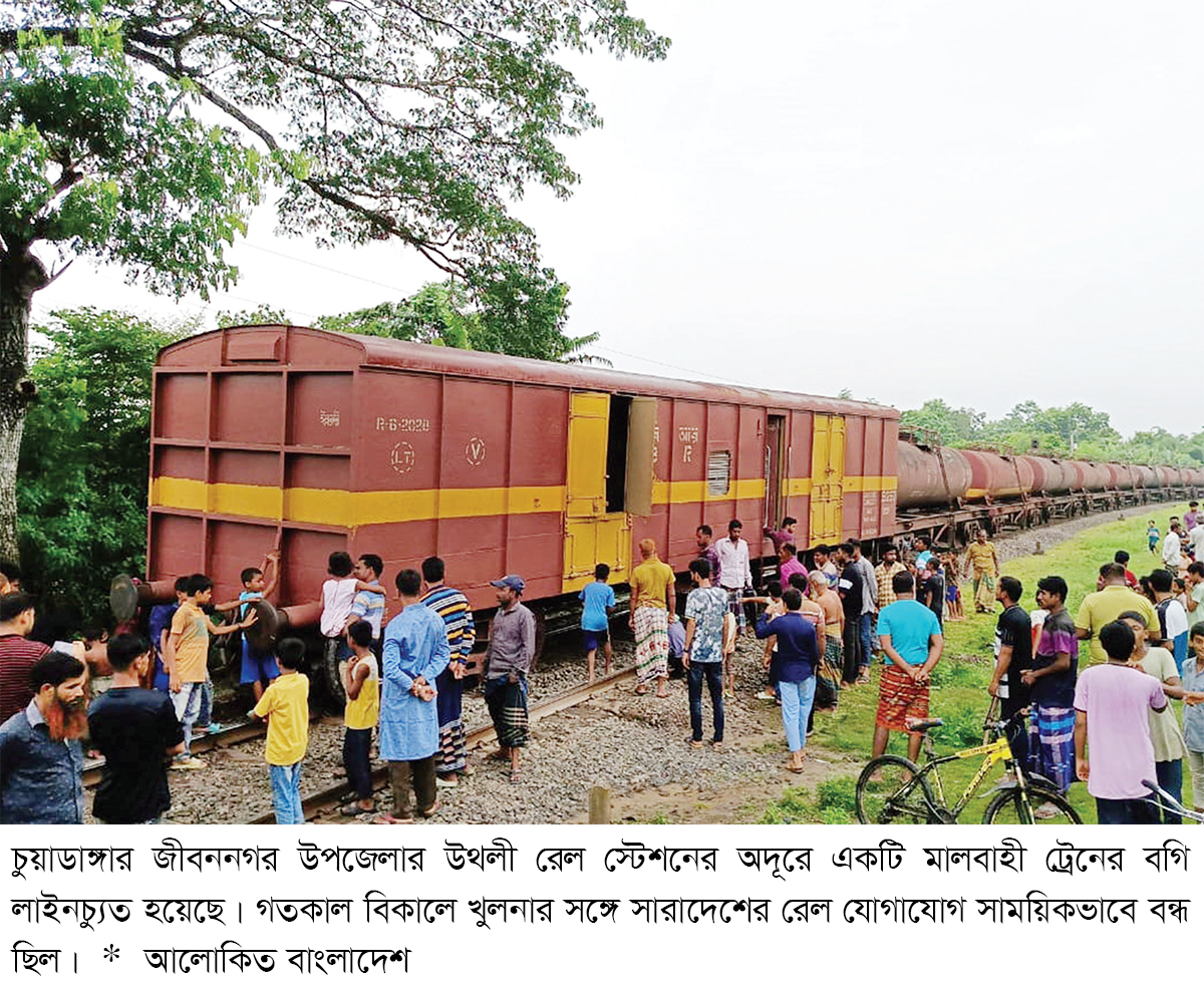 চুয়াডাঙ্গার জীবননগর উপজেলার উথলীতে মালবাহী ট্রেনের একটি বগি লাইনচ্যুত হয়েছে। গতকাল বিকেল ৫টা ৪০ মিনিটের দিকে উথলী রেলস্টেশনের কাছে এ দুর্ঘটনা ঘটে। ফলে খুলনার সঙ্গে সারা দেশের রেল যোগাযোগ বন্ধ হয়ে গেছে। উথলী রেলওয়ে স্টেশনের মাস্টার মিন্টু কুমার রায় গণমাধ্যমকে এ তথ্য নিশ্চিত করেছেন।