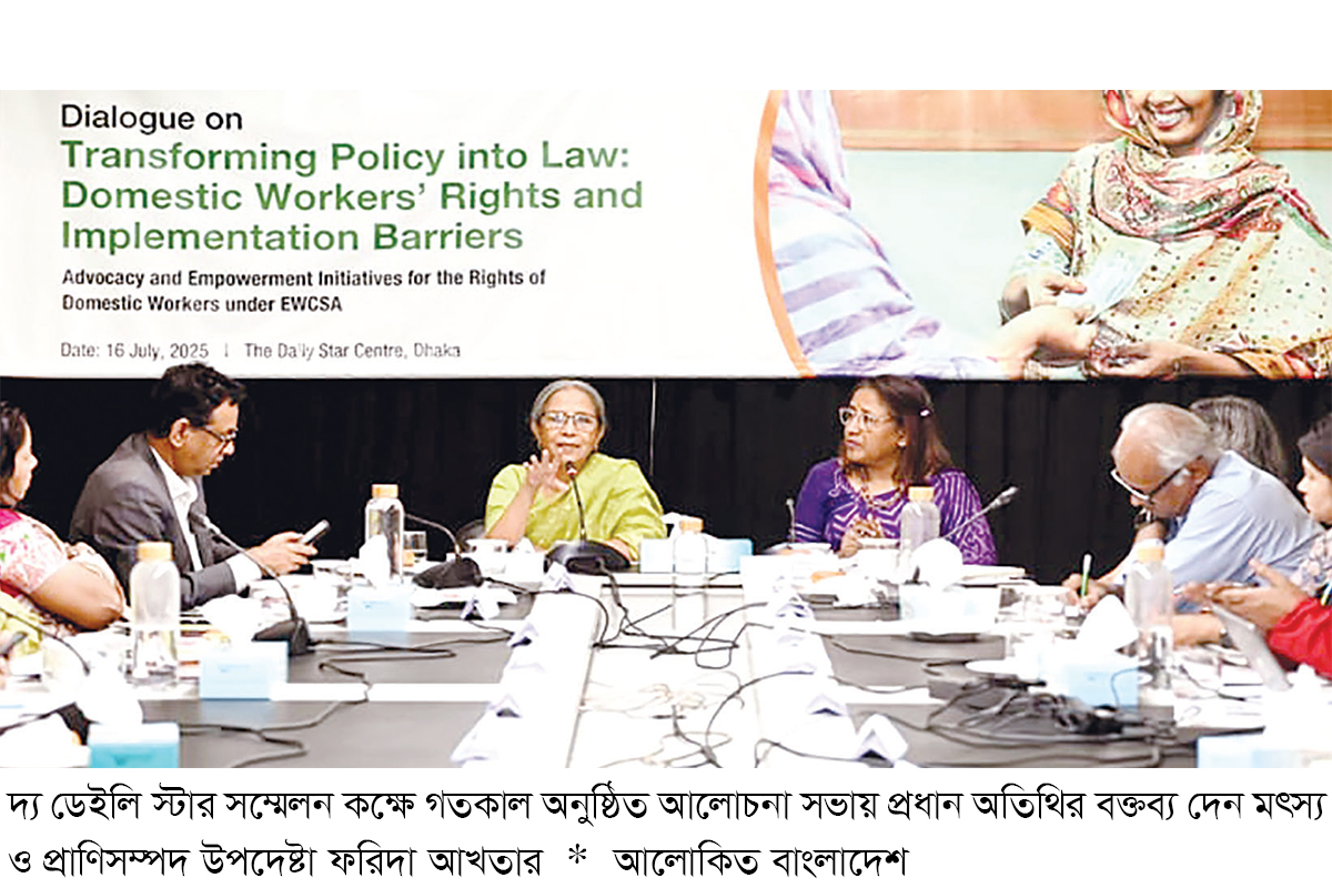 মৎস্য ও প্রাণিসম্পদ উপদেষ্টা ফরিদা আখতার বলেছেন, গৃহকর্মীদের ন্যায্য অধিকার আদায়ের বিষয়টি শ্রমিক অধিকার আন্দোলনের একটি গুরুত্বপূর্ণ অংশ হলেও এটি একইসঙ্গে নারী আন্দোলনেরও অবিচ্ছেদ্য অংশ। উপদেষ্টা গতকাল সকালে দ্য ডেইলি স্টার সম্মেলন কক্ষে অনুষ্ঠিত ‘গৃহকর্মীদের অধিকার ও বাস্তবায়নে চ্যালেঞ্জ : নীতিমালা থেকে আইন প্রণয়ন নিয়ে সংলাপ’- শীর্ষক আলোচনা সভায় প্রধান অতিথির বক্তৃতায় এ কথা বলেন। মৎস্য ও প্রাণিসম্পদ উপদেষ্টা বলেন, বাসাবাড়িতে যদি গৃহকর্মী না থাকতেন, তাহলে নারীদের নিজেদেরকেই সেই কাজগুলো করতে হতো। তাই এক্ষেত্রে নারীদের মধ্যেই পারষ্পরিক সহানুভূতি ও সমর্থনের মনোভাব গড়ে তোলা প্রয়োজন। তিনি বলেন, গৃহকর্মীদের প্রতি সম্মান দেখিয়ে কথা বলা উচিত এবং গৃহকর্মী শব্দের ব্যবহার নিয়েও আমাদের চিন্তা করা উচিত। উপদেষ্টা আরও বলেন, ফ্ল্যাট বাড়িগুলো আধুনিক হলেও, সেখানে গৃহকর্মীদের বিশ্রামের স্থান রাখা হয় না। ভবিষ্যতের বাড়ি নির্মাণে তাদের জন্য উপযুক্ত বিশ্রাম ও মানবিক পরিবেশ নিশ্চিত করা জরুরি। উপদেষ্টা বলেন, গৃহকর্মীদের স্বাস্থ্য ভালো না থাকলে, পুরো পরিবারের স্বাস্থ্য ঝুঁকিতে পড়ে। অথচ তারা নিজেরাও মানুষের মতো মর্যাদাপূর্ণ জীবনের অধিকারী। অনেক সময় ক্ষুধা নিবৃত্ত করতে তারা জর্দা ও গুলসহ বিভিন্ন তামাকজাত পণ্য গ্রহণ করেন। তাই সময়মতো খাবার নিশ্চিত করলে, এই সমস্যাও কমে আসবে। সবুজের অভিযান ফাউন্ডেশন, অক্সফাম ও দ্য ডেইলি স্টার যৌথভাবে আয়োজিত অনুষ্ঠানে ইউরোপিয়ান সিভিল প্রটেকশন অ্যান্ড হিউম্যানিটারিয়ান এইড অপারেশনসের সহযোগিতায় আলোচনা অনুষ্ঠানে বিশেষ অতিথি হিসেবে বক্তৃতা করেন শ্রম ও কর্মসংস্থান মন্ত্রণালয়ের সচিব এএইচএম সফিকুজ্জামান। এ সময় আরও বক্তৃতা করেন, নারী সংস্কার কমিশনের সাবেক সদস্য মাহীন সুলতান, শ্রম সংস্কার কমিশনের সাবেক সদস্য রাজেকুজ্জামান রতন ও বাংলাদেশ নারী শ্রমিক কেন্দ্রের নির্বাহী পরিচালক সুমাইয়া ইসলাম। সংলাপে বিভিন্ন শ্রেণি-পেশার প্রতিনিধি, মানবাধিকার কর্মী ও উন্নয়ন সংস্থার প্রতিনিধিরা অংশগ্রহণ করেন। এতে স্বাগত বক্তৃতা করেন সবুজের অভিযান ফাউন্ডেশনের নির্বাহী পরিচালক মাহমুদা বেগম।