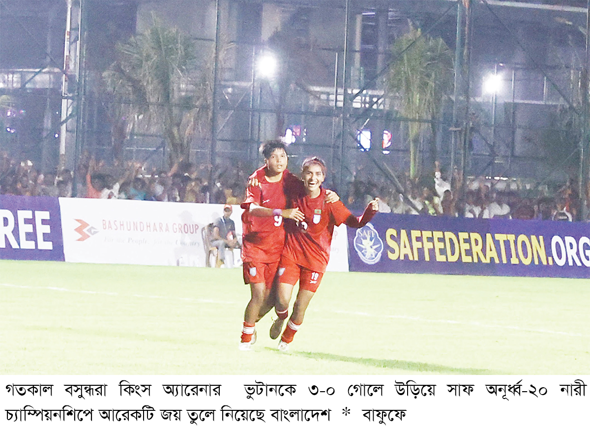 সাফ অনূর্ধ্ব-২০ চ্যাম্পিয়নশিপে আরেকটি জয় পেয়েছে বাংলাদেশের মেয়েরা। গতকাল বৃহস্পতিবার বসুন্ধরা কিংস অ্যারেনার ভুটানকে ৩-০ গোলে উড়িয়ে দিয়েছে লাল সবুজের ফটবল কন্যারা। স্বাগতিকদের হয়ে তৃষ্ণা রানীর জোড়া গোল করেছেন। অন্য গোলটি করেন মুনকি আক্তার। টানা চার ম্যাচ জিতে শিরোপার আরও কাছে পিটার বাটলারের শিষ্যরা।