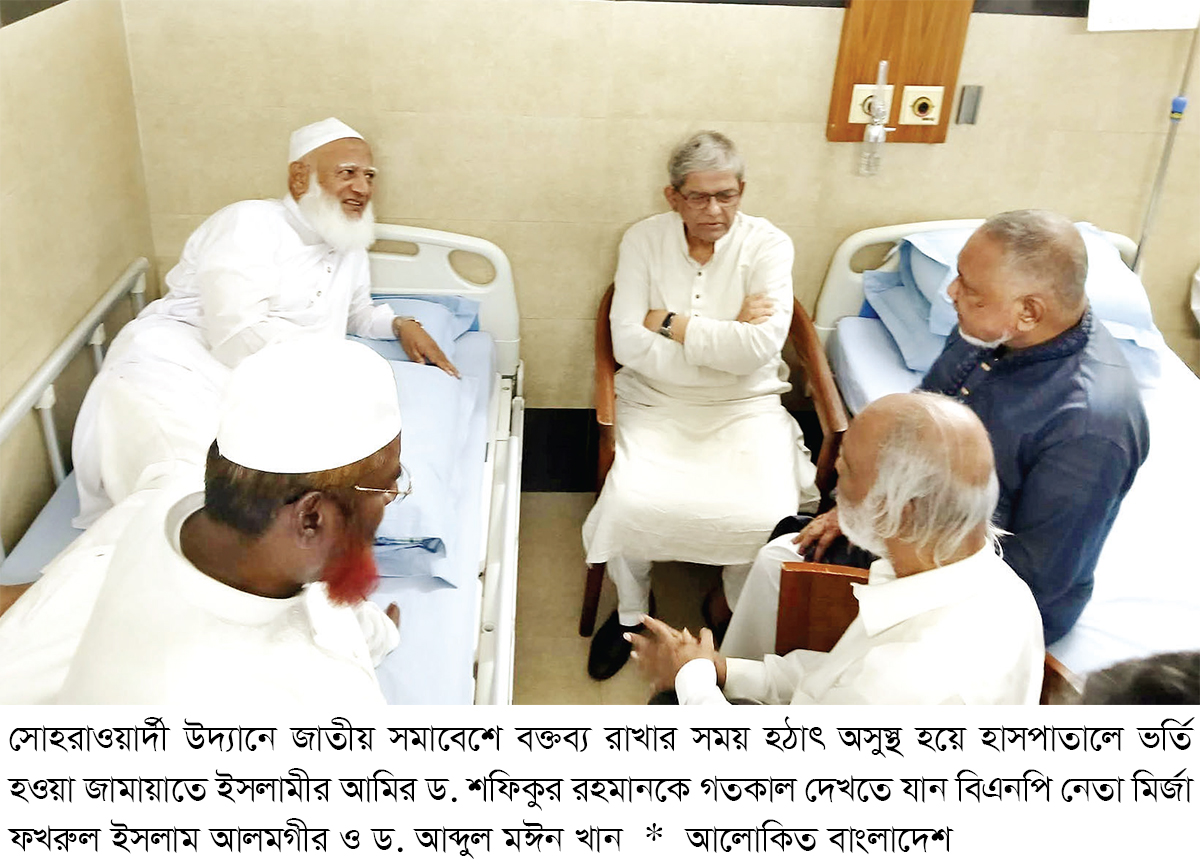 এদিকে, জামায়াত আমীরকে দেখতে ইবনে সিনা হাসপাতালে যা বিএনপি মহাসচিব মির্জা ফখরুল ইসলাম আলমগীর। এসময় তিনি জামায়াত আমীরের রোগ মুক্তি কামনা করেন। এর আগে, বিকালে প্রধান অতিথির বক্তব্যে দিচ্ছিলেন তিনি। একপর্যায়ে তিনি মঞ্চে পড়ে যান। তখন মঞ্চে উপস্থিত অন্যান্য নেতারা দৌড়ে আসেন এবং তাকে ঘিরে ধরেন। চিকিৎসকরাও এসে চিকিৎসা দেওয়া শুরু করেন। স্বেচ্ছাসেবকরাও তৎপর হয়ে উঠেন।