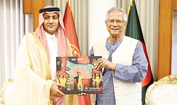 প্রধান উপদেষ্টা প্রফেসর মুহাম্মদ ইউনূস গতকাল ঢাকায় রাষ্ট্রীয় অতিথি ভবন যমুনায় বাংলাদেশে সৌদি আরবের নবনিযুক্ত রাষ্ট্রদূত Dr. Abdullah Zafer H. bin Abiyah -কে জুলাই অভ্যুত্থানের পরে বাংলাদেশি শিক্ষার্থীদের আঁকা দেয়াল চিত্রের ওপর প্রকাশিত ‘ART OF TRIUMPH’ বইটি উপহার দেন * পিআইডি