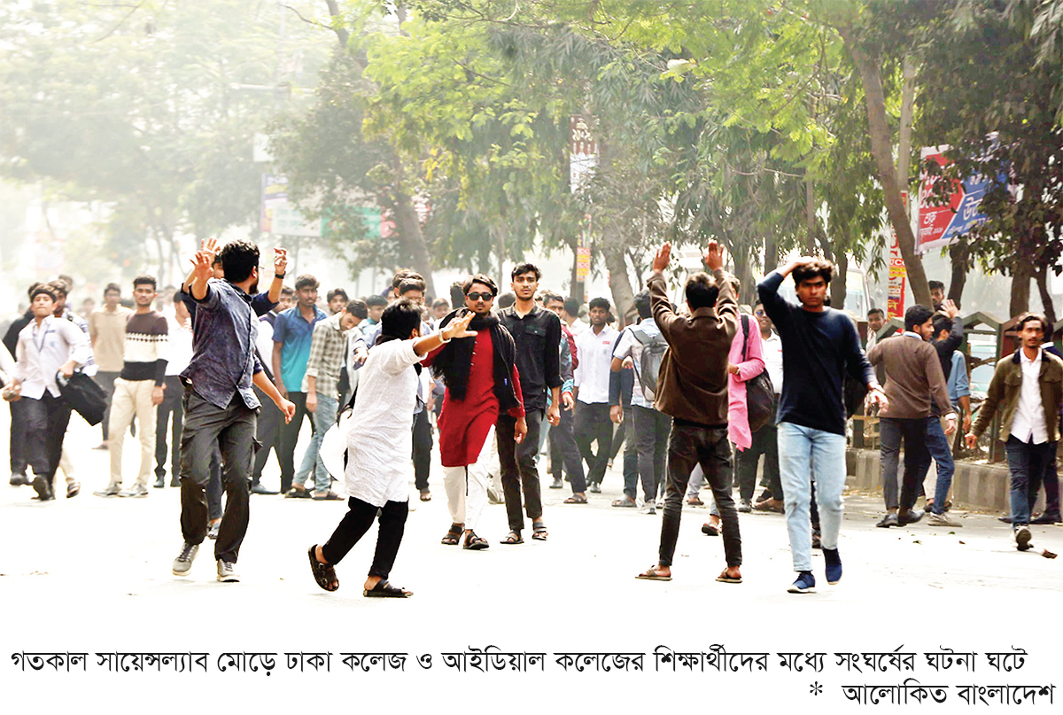 রাজধানীর সায়েন্স ল্যাব এলাকায় গতকাল বৃহস্পতিবার ঢাকা কলেজ ও ধানমন্ডি আইডিয়াল কলেজের শিক্ষার্থীদের মধ্যে পাল্টাপাল্টি ধাওয়া ও সংঘর্ষের ঘটনা ঘটেছে। এ সময় মিরপুর থেকে নিউমার্কেটগামী সড়কে এক ঘণ্টার বেশি যান চলাচল বন্ধ হয়ে যায়।