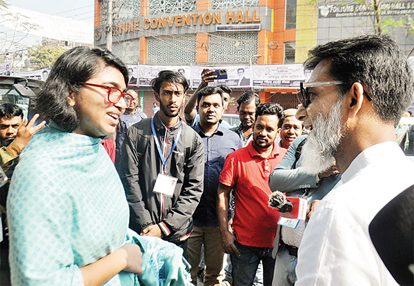 ঢাকা-৯ আসনের বিএনপি প্রার্থী হাবিবুর রশিদ হাবিব গতকাল বৃহস্পতিবার খিলগাঁও মডেল কলেজ কেন্দ্রের সামনে স্বতন্ত্র প্রার্থী ডা. তাসনিম জারার সঙ্গে শুভেচ্ছা বিনিময় করেন * আলোকিত বাংলাদেশ