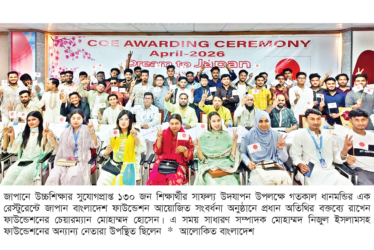 জাপানে উচ্চশিক্ষার সুযোগপ্রাপ্ত ১৩০ জন শিক্ষার্থীর সাফল্য উদযাপন উপলক্ষে গতকাল ধানমন্ডির এক রেস্টুরেন্টে জাপান বাংলাদেশ ফাউন্ডেশন আয়োজিত সংবর্ধনা অনুষ্ঠানে প্রধান অতিথির বক্তব্যে রাখেন ফাউন্ডেশনের চেয়ারম্যান মোহাম্মদ হোসেন। এ সময় সাধারণ সম্পাদক মোহাম্মদ নিজুল ইসলামসহ ফাউন্ডেশনের অন্যান্য নেতারা উপস্থিত ছিলেন * আলোকিত বাংলাদেশ