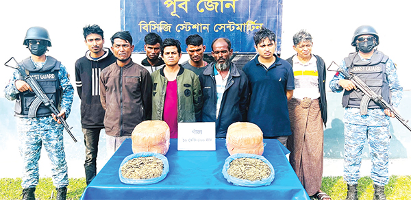 সেন্টমার্টিনে ৩ লাখ ১২ হাজার টাকা মূল্যের গাঁজাসহ ৯ জন মাদক পাচারকারীকে আটক করেছে কোস্ট গার্ড। গতকাল শনিবার দুপুরে কোস্ট গার্ড মিডিয়া কর্মকর্তা লেফটেন্যান্ট কমান্ডার সাব্বির আলম সুজন এ তথ্য জানান। তিনি বলেন, গোপন সংবাদের ভিত্তিতে গতকাল শনিবার মধ্যরাত ১টায় কোস্ট গার্ড স্টেশন সেন্টমার্টিন কর্তৃক সেন্টমার্টিন ছেঁড়াদ্বীপের দক্ষিণ-পশ্চিম সংলগ্ন সমুদ্র এলাকায় একটি বিশেষ অভিযান পরিচালনা করা হয়। অভিযান চলাকালীন আভিযানিক দল একটি সন্দেহজনক ইঞ্জিনচালিত কাঠের বোটকে থামার সংকেত প্রদান করলে সংকেত অমান্য করে বোটটি পালিয়ে যাওয়ার চেষ্টা করে। অতঃপর আভিযানিক দল বোটটি ধাওয়া করে আটক করতে সক্ষম হয়। পরবর্তীতে আটককৃত বোটে তল্লাশি চালিয়ে প্রায় ৩ লাখ ১২ হাজার টাকা মূল্যের ১০ কেজি ৪০০ গ্রাম গাঁজাসহ ৯ জন মাদক পাচারকারীকে আটক করা হয়। জব্দকৃত আলামত ও আটককৃত পাচারকারীদের পরবর্তী আইনানুগ ব্যবস্থা গ্রহণের কার্যক্রম প্রক্রিয়াধীন রয়েছে। তিনি আরও বলেন, মাদকের ভয়াল থাবা থেকে তরুণ প্রজন্মকে রক্ষায় কোস্ট গার্ড ভবিষ্যতেও এ ধরনের অভিযান অব্যাহত রাখবে।