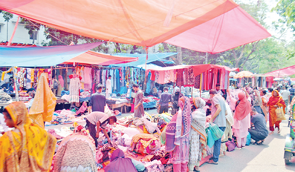 সাপ্তাহিক ছুটির দিন গতকাল শুক্রবার রাজধানীর মতিঝিল আইডিয়াল স্কুল অ্যান্ড কলেজের সামনের সড়কে হলিডে মার্কেট থেকে কেনাকাটা করছেন ক্রেতারা * আলোকিত বাংলাদেশ