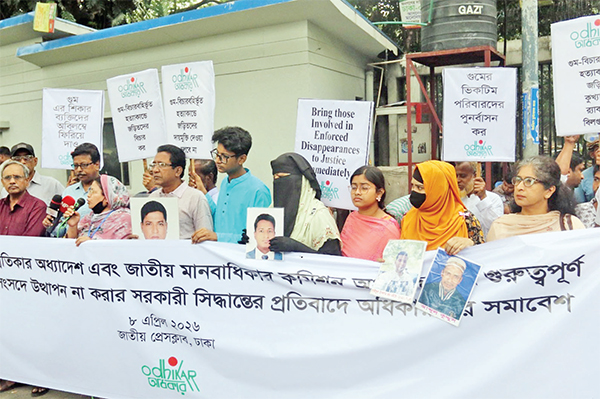 গুম, বিচারবহির্ভূত হত্যাকাণ্ডের বিচার গুম হওয়া ব্যাক্তিদের ফিরিয়ে দেওয়ার দাবিতে গতকাল জাতীয় প্রেসক্লাবের সামনে আন্তর্জাতিক মানবাধিকার সংগঠন অধিকার সমাবেশ করে * আলোকিত বাংলাদেশ
