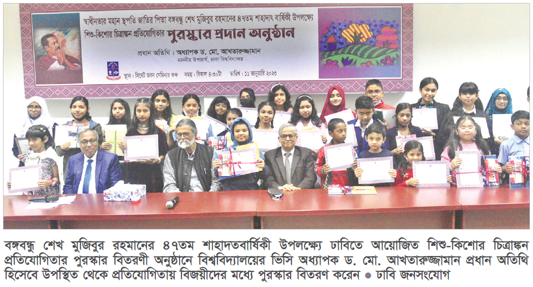 বিশ্ববিদ্যালয়ের ভিসি অধ্যাপক ড. মো. আখতারুজ্জামান আলোচনা সভা শেষে বিজয়ীদের মাঝে পুরস্কার ও সনদ বিতরণ করেন। ঢাকা বিশ্ববিদ্যালয় চারুকলা অনুষদের তত্ত্বাবধানে এই চিত্রাঙ্কন প্রতিযোগিতা এবং পুরস্কার বিতরণী অনুষ্ঠানের আয়োজন করা হয়। চারুকলা অনুষদের ডিন অধ্যাপক নিসার হোসেন অনুষ্ঠানে সভাপতিত্ব করেন। অনুষ্ঠান সঞ্চালন করেন রেজিস্ট্রার প্রবীর কুমার সরকার। উল্লেখ্য, গত ১৫ আগস্ট ২০২২ ছাত্র-শিক্ষক কেন্দ্রে এই শিশু-কিশোর চিত্রাঙ্কণ প্রতিযোগিতা অনুষ্ঠিত হয়। প্রতিযোগিতায় মোট তিনটি গ্রুপে শতাধিক প্রতিযোগী অংশগ্রহণ করে। প্রত্যেক গ্রুপের সেরা ১০জন করে মোট ৩০জন প্রতিযোগীকে পুরস্কার প্রদান করা হয়।