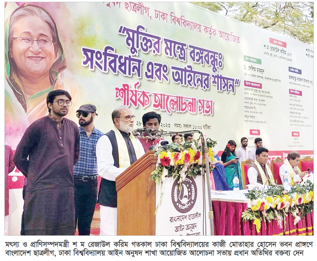 সংবিধানের বিধি-বিধানের আলোকে বঙ্গবন্ধু কন্যা শেখ হাসিনা দেশে আইনের শাসন প্রতিষ্ঠা করেছেন বলে মন্তব্য করেছেন মৎস্য ও প্রাণিসম্পদ মন্ত্রী শ ম রেজাউল করিম। গতকাল ঢাকা বিশ্ববিদ্যালয়ের কাজী মোতাহার হোসেন ভবন প্রাঙ্গণে বাংলাদেশ ছাত্রলীগ, ঢাকা বিশ্ববিদ্যালয় আইন অনুষদ শাখা আয়োজিত ‘মুক্তির মন্ত্রে বঙ্গবন্ধু : সংবিধান এবং আইনের শাসন’ শীর্ষক আলোচনা সভায় প্রধান অতিথির বক্তব্যে তিনি এমন মন্তব্য করেন।