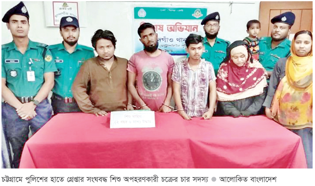 চট্টগ্রামে সংঘবদ্ধ শিশু অপহরণকারী চক্রের চার সদস্যকে গ্রেপ্তার করেছে পুলিশ। তাদের কাছ থেকে উদ্ধার করা হয়েছে আড়াই বছরের এক শিশুকে। গত শুক্রবার সকাল থেকে রাত পর্যন্ত অভিযান চালিয়ে বায়েজিদ ও হাটহাজারী এলাকা থেকে অপহরণকারী চারজনকে গ্রেপ্তার করা হয়। গতকাল বেলা ১১টার দিকে চান্দগাঁও থানায় আয়োজিত সংবাদ সম্মেলনে ভারপ্রাপ্ত কর্মকর্তা (ওসি) মো. খাইরুল ইসলাম এ ঘটনার বিস্তারিত বর্ণনা করেন।