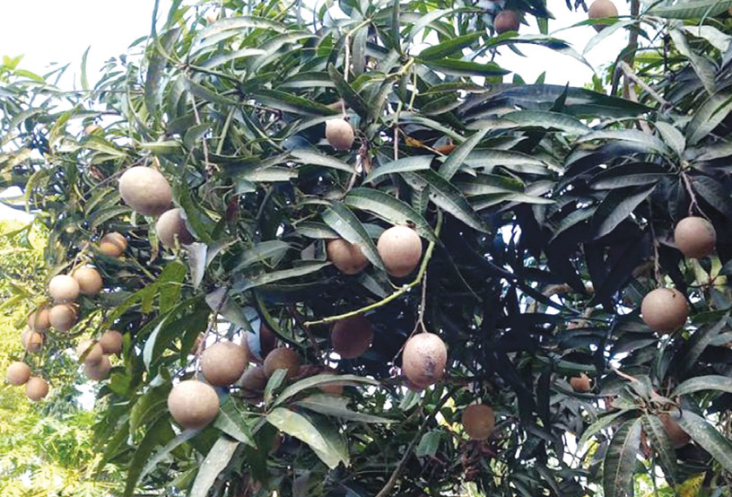 আমগাছে থোকায় থোকায় ঝুলছে ফল। তবে ফলগুলোকে সফেদা ভেবে ভুল করছেন অনেকে। কিন্তু আমগাছে সফেদা ফল কীভাবে হবে? এ নিয়ে জনসাধারণের মধ্যে কৌতূহল সৃষ্টি হয়েছে। তাই অদ্ভুত এই ফল দেখতে অনেকে ভিড় করলেও কেউ খেতে সাহস পাচ্ছেন না। ঘটনাটি বাগেরহাটের শরণখোলা উপজেলার রায়েন্দা ইউনিয়নের পশ্চিম খাদা, ধানসাগর ইউনিয়নের সিংবাড়ি ও খোন্তাকাটা ইউনিয়নের রাজৈর গ্রামের বেশ কয়েকটি বাগানের আমগাছে এমন ফল চোখে পড়ে। কাছে গিয়ে ধরে না দেখলে কোনোভাবেই বোঝার উপায় নেই, সেগুলো আম নাকি সফেদা। স্থানীয়রা জানালেন, ফলগুলো আমই। হঠাৎ সবুজ আমের গায়ে এমন ধূসর বর্ণ দেখে এগুলোকে সফেদা ভেবে ভুল করছেন সবাই। উপজেলা কৃষি বিভাগ জানিয়েছেন, ছত্রাকের আক্রমণে আমগুলো বর্ণ ও আকার পরিবর্তন হয়ে সফেদার মতো দেখাচ্ছে। পশ্চিম খাদা গ্রামের আম বাগান মালিক শাহজাহান আকন বলেন, ‘আমার বয়স ৭৫ বছর। এর আগে কখনও আমগাছে সফেদার মতো ফল হতে দেখিনি। আমগুলোর ভেতরে নাকি পোকায় ভরা। সিংবাড়ি গ্রামের সুমন সরদার বলেন, আমাদের গ্রামে বাণিজ্যিকভাবে আমের চাষাবাদ না হলেও প্রায় প্রতিটি বাড়িতে কম বেশি আমগাছের বাগান রয়েছে। এ বছর আমও ধরেছে বেশ। কিন্তু কিছু গাছের আম সফেদা ফলের মতো ধূসর রঙের হওয়ায় তা খাওয়া নিয়ে আমার পরিবারসহ এলাকাবাসীর মধ্যে ভীতি দেখা দিয়েছে। যে কারণে এসব আম চাষিরা বাজারে বিক্রিও করতে পারছে না। শরণখোলা উপজেলা কৃষি কর্মকর্তা দেবব্রত সরকার বলেন ‘এটা এক ধরনের ছত্রাকের আক্রমণে হয়ে থাকে। ছায়া যুক্ত স্থানে গাছ থাকলে এমন ছত্রাক দেখা দিতে পারে। এই আমের গায়ে ছত্রাকের আবরণ পড়ে যা দেখতে সফেদা ফলের মতো হয়েছে। এতে ভয়ের কিছু নেই। ছত্রাকের কারণে রং পরিবর্তন হলেও যেকোনো সময় এ আম খাওয়া যাবে। বাগেরহাটে গত এক মাস ধরে চলা তাপদাহে বাতাসে আর্দ্রতা কমে যাওয়ার কারণে আমে ছত্রাকের আক্রমণ হয়েছে। যাদের গাছে এমন আম হচ্ছে তারা কৃষি অফিসের পরামর্শ নিয়ে কিটনাশক স্প্রে করলে আমের এই ছত্রাকজনিত সমস্যা সমাধান হবে। এ ধরনের আম প্রথমে আফ্রিকা মহাদেশের উগান্ডায় দেখা দেয়। এটা এখন বাংলাদেশের কিছু অঞ্চলে আম গাছেও দেখা যাচ্ছে।