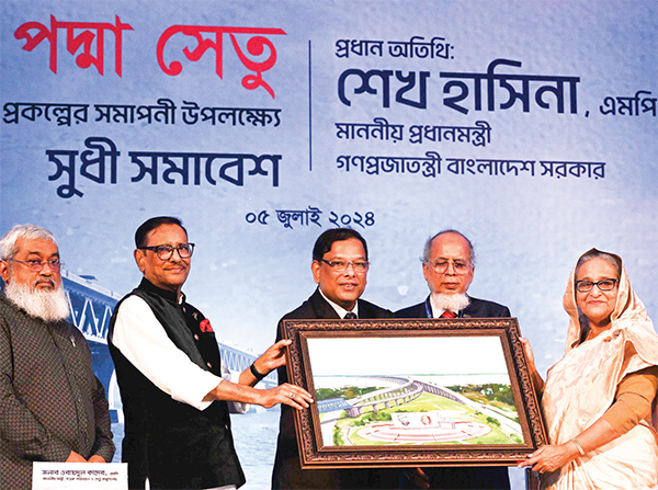 প্রধানমন্ত্রী শেখ হাসিনাকে গতকাল পদ্মা সেতুর মাওয়া প্রান্তে পদ্মা সেতু প্রকল্পের সমাপনী উপলক্ষ্যে আয়োজিত সুধী সমাবেশে সড়ক পরিবহন ও সেতু মন্ত্রী ওবায়দুল কাদের পদ্মা সেতু প্রকল্পের একটি পেইন্টিং এবং ক্রেস্ট উপহার দেন * পিআইডি