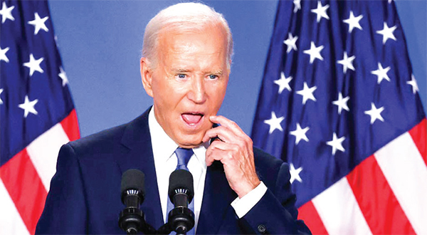যুক্তরাষ্ট্রে প্রেসিডেন্ট নির্বাচনি লড়াই থেকে সরে দাঁড়াতে জো বাইডেনের ওপর চাপ বাড়তে থাকার মধ্যে গত বৃহস্পতিবার ন্যাটো সম্মেলন শেষের সংবাদ সম্মেলনের দিকে নজর ছিল সবার। এই সংবাদ সম্মেলন ছিল বাইডেনের জন্য নিজের বয়স নিয়ে উদ্বেগ দূরে করে শারীরিক ও মানসিক সক্ষমতা প্রমাণের এক অগ্নিপরীক্ষা। আর সেই মঞ্চেই একের পর এক ভুল করে তার অবস্থা হল লেজেগোবরে। সংবাদ সম্মেলন শুরুর ঠিক আগ মুহূর্তে রাশিয়ার প্রেসিডেন্ট ভ্লাদিমির পুতিন এবং ইউক্রেইনের প্রেসিডেন্ট ভলোদিমির জেলেনস্কিকে গুলিয়ে ফেলেন অশীতিপর এই প্রেসিডেন্ট। জেলেনস্কিকে মুখ ফসকে ‘পুতিন’ সম্বোধন করেন বাইডেন। আর শুধু তাই নয়, প্রতিদ্বন্দ্বী রিপাবলিকান নেতা ডনাল্ড ট্রাম্পকে ভাইস প্রেসিডেন্ট কমলা হ্যারিসও বানিয়ে বসলেন। সংবাদ সম্মেলনে কমলা হ্যারিস সম্পর্কে বলতে গিয়ে তার নামের জায়গায় ‘ট্রাম্প’ বলে ফেলেন বাইডেন। কিন্তু এত ভুলের পরও বাইডেন নির্বাচনি লড়াইয়ে থাকার ব্যাপারে অনড় অবস্থান প্রকাশ করেছেন। বয়স নিয়ে উদ্বেগ উপেক্ষা করে দৃঢ়তার সঙ্গেই বাইডেন বলেছেন, তিনি নির্বাচনে লড়বেন। নিজেকে সুস্থ দাবি করে বাইডেন বলেন, আসন্ন প্রেসিডেন্ট নির্বাচনে ট্রাম্পকে পরাজিত করার জন্য তিনিই সেরা প্রার্থী। গত বৃহস্পতিবার রাতে যুক্তরাষ্ট্রের ওয়াশিংটন ডিসিতে পশ্চিমা সামরিক জোট নেটোর ৭৫তম সম্মেলন শেষে একক সংবাদ সম্মেলন করেন বাইডেন। এক ঘণ্টার এ সংবাদ সম্মেলনে তার রাজনৈতিক জীবন, পুননির্বাচিত হওয়ার আশা, প্রেসিডেন্সি, পররাষ্ট্রনীতি, যুক্তরাষ্ট্রের অভ্যন্তরীন ইস্যু ও গাজার যুদ্ধসহ নানা বিষয় উঠে এসেছে।