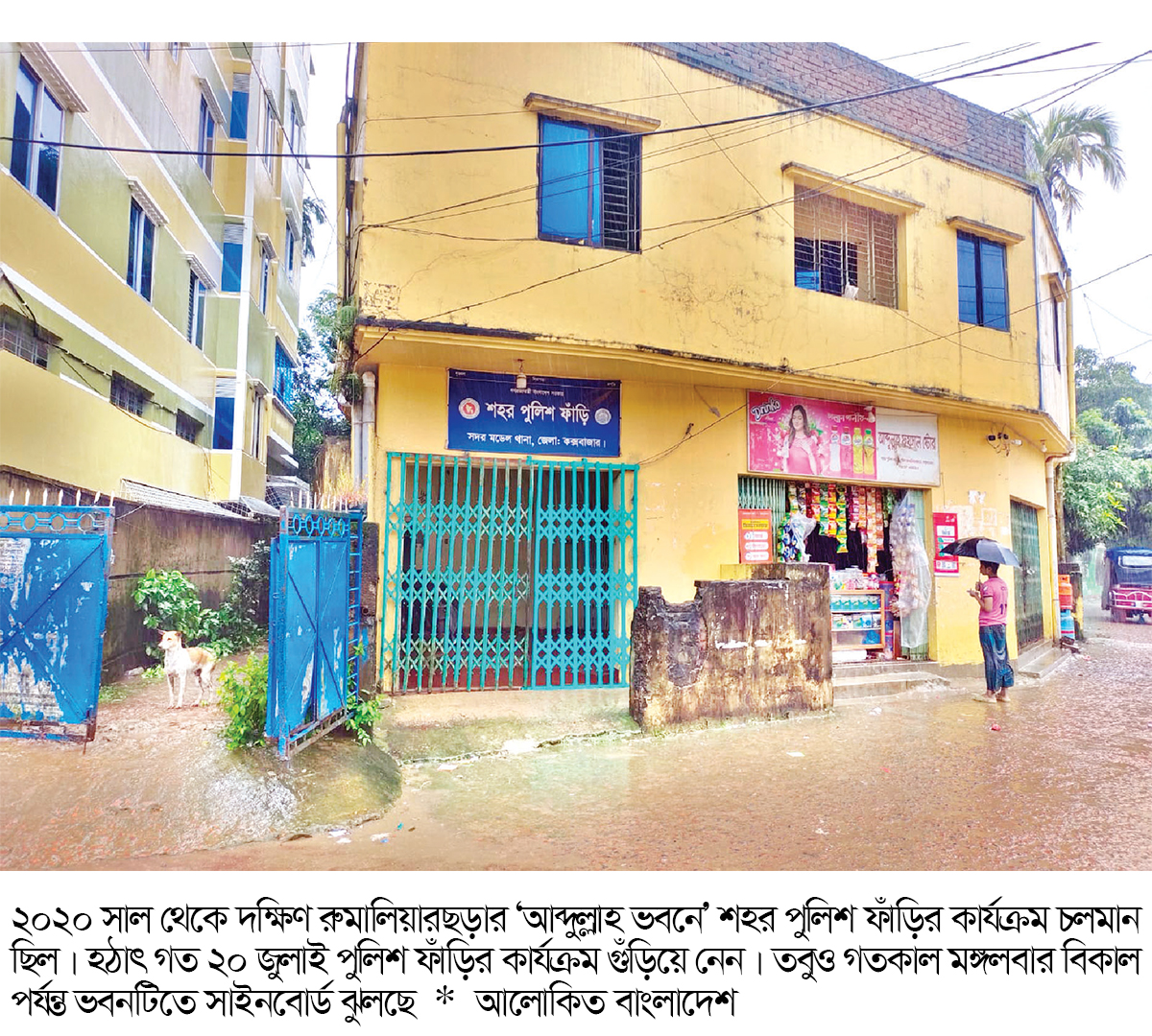 অন্যদিকে ভাড়াটে ভবনে কক্সবাজার শহর পুলিশ ফাঁড়ির কার্যক্রম না থাকলেও ওই ভবনে ফাঁড়ির সাইনবোর্ডটি ঝুলছে। গত সোমবার রাত সাড়ে ১০টায় সরেজমিন গেলে প্রতিবেদকের চোখে ধরা পড়ে। ওই ভবনটির মালিক নতুন করে রংসহ যাবতীয় কাজ সারতে দেখা গিয়েছে।