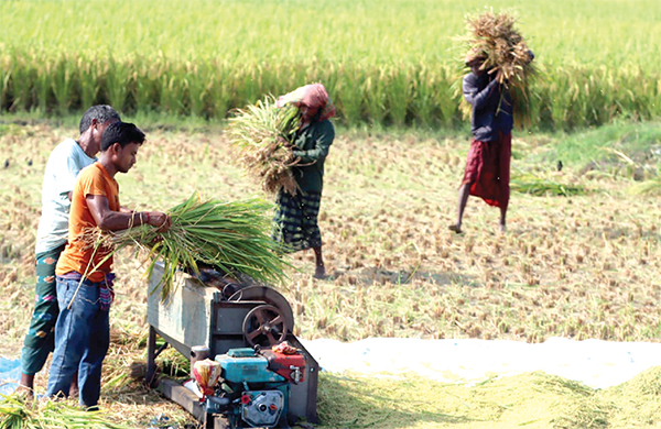 বিস্তীর্ণ মাঠজুড়ে ঘন সবুজের সমারোহ, আগাম জাতের পাকা ধান বাতাসে দোল খাচ্ছে। আগাম জাতের কৃষি মাঠে পুরোদমে ধান পেকে গেছে। জেলায় স্বল্পমেয়াদি উচ্চ ফলনশীল জাতের আগাম আমন ধান পাকতে শুরু করেছে। এরইমধ্যে ধান কাটাও শুরু হয়েছে। আগাম ধান পেয়ে খুশি কৃষক। এদিকে আগাম ধান কাটা শুরু হওয়ায় কার্তিক মাসে শ্রমহীন থাকতে হচ্ছে না কৃষি শ্রমিকদের। কৃষি সম্প্রসারণ অধদিফতর রংপুর সূত্রে জানা যায়, এবারে রংপুর জলোয় ১ লাখ ৬৬ হাজার ৯৪০ হক্টের জমিতে আমন ধান চাষ হয়েছে। আগাম ধান কাটা শেষে আগাম জাতের আলুর জন্য জমি প্রস্তুত করবেন চাষিরা। এজন্য আগাম ধান কাটছে তারা। ইতোমধ্যে ১৫০ হক্টের জমির আগাম ধান কাটা হয়েছে। এই স্বল্পময়োদি উচ্চ ফলনশীল জাতের আগাম আমন ধান রোপণে ৮০ থেকে ৯০ দিনের মধ্যে এই ধান পাকে। এই আগাম ধান কাটার পর আলুসহ নানারকম রবিশস্য আবাদ করে থাকেন চাষিরা। সেই লক্ষ্যে মিঠাপুকুর, পীরগঞ্জ উপজেলা, সদর উপজলো, গংগাচড়াসহ কয়েক উপজেলায় এই আগাম ধানের চাষ বেশি হয় থাকে। পীরগঞ্জ উপজেলার ১৫টি ইউনিয়নের কৃষি পল্লীতে কিছু কিছু ধান খেতে সোনালি রং ধরেছে। আগাম জাতের ধানের ফলন আর কৃষি মাঠে পাকা ধানের সুগন্ধে হাসি ফুটেছে চাষিদের মুখে। পোকামাকড়ের বালাই অনেকটাই কম আর ধান অসময়ে ফলনের কারণে উপজেলার অনেক কৃষকদের মধ্যে চাষের বেশ আগ্রহ দেখা যাচ্ছে। উপজেলা কৃষি বিভাগ সূত্রে জানা গেছে, উপজেলায় ব্রি ধান ৭১, ব্রি ধান ৭৫, বিনা ধান ১৭, বিনা ধান ৭, ব্রি ধান ৮৭ এবং হাইব্রিডসহ ১২টি জাতের ধান এবছর ৭ হাজার ৫০০ হেক্টর জমিতে চাষ করা হয়েছে। আগাম জাতের ধান ইতিমধ্যে চাষিরা কাটা মারা শুরু করেছে। কৃষি পল্লি এলাকা ঘুরে ধান চাষিদের সাথে কথা হলে তারা বলছেন, কম সময়ে ফলন বেশি এবং কম খরচে আগাম জাতের ধান রোপণ করে ভালো ফলন পাবার সফলতার মুখ দেখছেন চাষিরা। আগাম ধান কেটে সঠিক সময়ে সরিষা এবং সবজি চাষ করবে। তবে অনেকেই ধারণা করছেন এবার আগাম জাতের ধানের ফলন ভালো হবে। ধান চাষি বড় ভগবানপুর গ্রামের মিলন মিয়া, জাদবপুর গ্রামের মোত্তালিব হোসেন, অনন্তরামপুর গ্রামের আরাফাত হোসেন বলেন, তারা প্রতিবছর আগাম জাতের ধানের চাষাবাদ করে থাকেন। বৃষ্টি পানির অপেক্ষায় না থেকে সেচ পাম্পের পানি সেচ দিয়ে এই ধানের চাষ করে চাষাবাদ করে। তারা ইতিপূর্বেও লাভবান হয়েছে। এতে করে ধান কাটা শ্রমিকের সংকট হয় না। গোখাদ্য খড় ব্যবসায়ীরা জমি থেকে ধান কাটা মাড়াই করে ঘরে উঠিয়ে দেয়, খরচ অনেক কম হয়। তাছাড়া নতুন ধানের চাল বাজারেও অনেক চাহিদা রয়েছে। এসব ধান কেটে দ্রুত তেলজাতীয় ফসলের আবাদ করতে পারবে তারা। বর্তমানে কৃষকদের মাঝে এ ধান চাষের ব্যাপক চাহিদা বাড়ছে তবে আগাম ধরনের উপর পাখিদের নজর বেশি। বাবুইসহ কয়েক প্রকারের পাখি ঝাঁকে ঝাঁক
