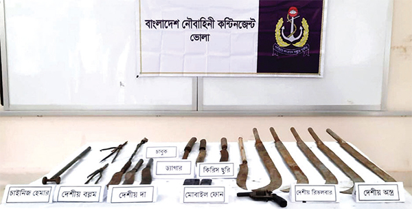 সরকারের নির্দেশনা মোতাবেক ‘ইন এইড টু সিভিল পাওয়ার’এর আওতায় বাংলাদেশ নৌবাহিনী অবৈধ অস্ত্র উদ্ধার ও সন্ত্রাস নির্মূলে নিয়মিত যৌথ বাহিনী অভিযান পরিচালনা করে আসছে। এরই ধারাবাহিকতায় গোপন তথ্যের ভিত্তিতে গতকাল শনিবার ভোর রাতে নৌবাহিনী কন্টিনজেন্ট ভোলা সদর থানার রৌদের হাট এলাকায় অভিযান পরিচালনা করে। অভিযানে চিহ্নিত ডাকাত, অস্ত্র ব্যবসায়ী ও চাঁদাবাজ মো. মনির হোসেন ব্যাপারী ও মাদক ব্যবসায়ী মো. রাসেলকে আটক করা হয়। এ সময় আটককৃতদের তথ্যের ভিত্তিতে বিভিন্ন জায়গায় তল্লাশি করে একটি দেশীয় রিভলবার, ৫টি রামদা, ৩টি ক্রিজ, ১টি ড্রেগার, ২টি বল্লম, ৩টি দা, ১টি চাবুক, ১টি চাইনিজ হেমার, ২টি মোবাইল সেট উদ্ধার করা হয়। আটককৃতদের নামে ভোলা সদর থানায় একাধিক মামলা রয়েছে বলে জানা যায়। অভিযানে ভোলা সদর থানার পুলিশ সদস্যরাও অংশগ্রহণ করেন। পরবর্তীতে আইনানুগ ব্যবস্থা গ্রহণের জন্য জব্দকৃত মালামালসহ আটককৃত ব্যক্তিদের ভোলা সদর থানায় হস্তান্তর করা হয়।