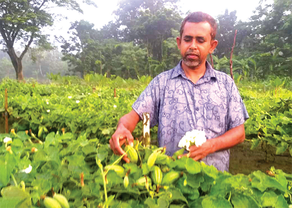 যশোরের কেশবপুরে মাচা পদ্ধতিতে পটল চাষে বাম্পার ফলন হয়েছে। এই পদ্ধতিতে পটল চাষে খরচ কম, লাভ হয় বেশি। চলতি বছর বেশি দাম পেয়ে কৃষকরা খুশি। যার কারণে এই পদ্ধতিতে পটল চাষে আগ্রহী হয়ে উঠেছেন এলাকার কৃষকরা। উপজেলার আলতাপোল এলাকায় মাচা পদ্ধতিতে পটল চাষে ঝুঁকে পড়েছেন চাষিরা। পটল একটি প্রধান গ্রীষ্মকালীন সবজি। উষ্ণ ও আর্দ্র জলবায়ু ও উর্বর মাটি পটল চাষের জন্য উত্তম। পটল দীর্ঘমেয়াদি ফসল এবং দামও ভালো পাওয়ায় কৃষকরা দিন দিন এ চাষে আগ্রহী হয়ে উঠেছেন। মাঠের চারিদিকে শুধু সবুজ পটল খেত। মাচার উপরে একটির গায়ের উপর আর একটি পটল যেন পদ্ম ফুলের মতো দাঁড়িয়ে আছে। মাটি থেকে দুই-তিন ফুট উঁচুতে তার ও বাঁশের তৈরি সারি সারি মাচার উপরে নিচে ঝুলছে অসংখ্য পটল। প্রতিদিন সকাল ও বিকালে এসব পটল খেত পরিচর্যায় কৃষকরা ব্যস্ত সময় পার করছেন। আবার ভোর হলেই চাষিরা খেত থেকে সপ্তাহে একদিন পটল তুলে বস্তায় ভরে ভ্যান বা অটোযোগে নিয়ে যাচ্ছেন কেশবপুর বাজারসহ আঠার মাইল বাজার, যশোর, খুলনাসহ বিভিন্ন অঞ্চলের মোকামে। অন্যান্য বছরের তুলনায় এবার পটলের বাম্পার ফলনের পাশাপাশি দামও বেশি হওয়ায় অর্থনৈতিক মুক্তির পথ খুঁজে পেয়ে কৃষকরা দারুন খুশি। এ দৃশ্য কেশবপুর উপজেলার আলতাপোল চারের মাথার বিস্তৃর্ণ মাঠজুড়ে বিরাজ করছে। প্রতি বছর ১৫ অক্টোবর থেকে ১৫ নভেম্বর মাসে পটল চাষ শুরু হয়। একবার চাষ করলে একাধারে ২-৩ বছর পর্যন্ত রাখা যায়। জীবনকাল বেশি ও রোগবালাই কম থাকায় কৃষকরা এ চাষে বেশি আগ্রহী হয়ে আার্থিক ভাবে লাভবান হন।