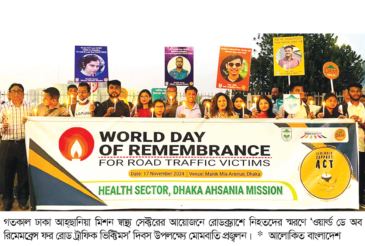 সড়ক দুর্ঘটনায় প্রাণ ও সম্পদের ক্ষয়ক্ষতি বিশ্বব্যাপী একটি অন্যতম প্রধান সামাজিক, অর্থনৈতিক ও জনস্বাস্থ্যগত সমস্যা। তাই নিরাপদ সড়কের দাবি যেমন দিন দিন জোরালো হচ্ছে, তেমনি এ লক্ষ্য অর্জনে নিরাপদ সড়ক গড়তে একটি ‘সড়ক নিরাপত্তা আইন’ প্রয়োজন বলে মন্তব্য করেছেন শিক্ষার্থীরা। ঢাকা আহ্ছানিয়া মিশন স্বাস্থ্য সেক্টরের আয়োজনে রোডক্র্যাশে নিহতদের স্মরণে ‘ওয়ার্ল্ড ডে অব রিমেমব্রেন্স ফর রোড ট্রাফিক ভিক্টিমস’ দিবস উপলক্ষ্যে মোমবাতি প্রজ্বলনে এ কথা বলেন তারা। রোডক্র্যাশে নিহতদের স্মরণে প্রতি বছর নভেম্বর মাসের তৃতীয় রোববার বিশ্বব্যাপী ‘ওয়ার্ল্ড ডে অব রিমেমব্রেন্স ফর রোড ট্রাফিক ভিক্টিমস’ দিবস পালন উপলক্ষ্যে গতকাল রোববার সন্ধ্যায় রাজধানীর মানিক মিয়া অ্যাভিনিউ জাতীয় সংসদ ভবনের দক্ষিণ পার্শ্বে অর্ধশত তরুণের অংশগ্রহণে মোমবাতি প্রজ্বলন করা হয়। মোমবাতি প্রজ্বলন কর্মসূচিতে সড়ক দুর্ঘটনায় ক্ষতিগ্রস্ত ব্যক্তি এবং তাদের পরিবারের সদস্যরাসহ ঢাকা আহ্ছানিয়া মিশন স্বাস্থ্য সেক্টরের কর্মকর্তারা, রোড সেফটি কোয়ালিশন বাংলাদেশের সদস্য সংস্থার প্রতিনিধিরা এবং শিক্ষার্থীসহ নানা শ্রেণিপেশার মানুষ অংশ নেন। এ সময় একটি সড়ক নিরাপত্তা আইনের দাবি জানান তারা।