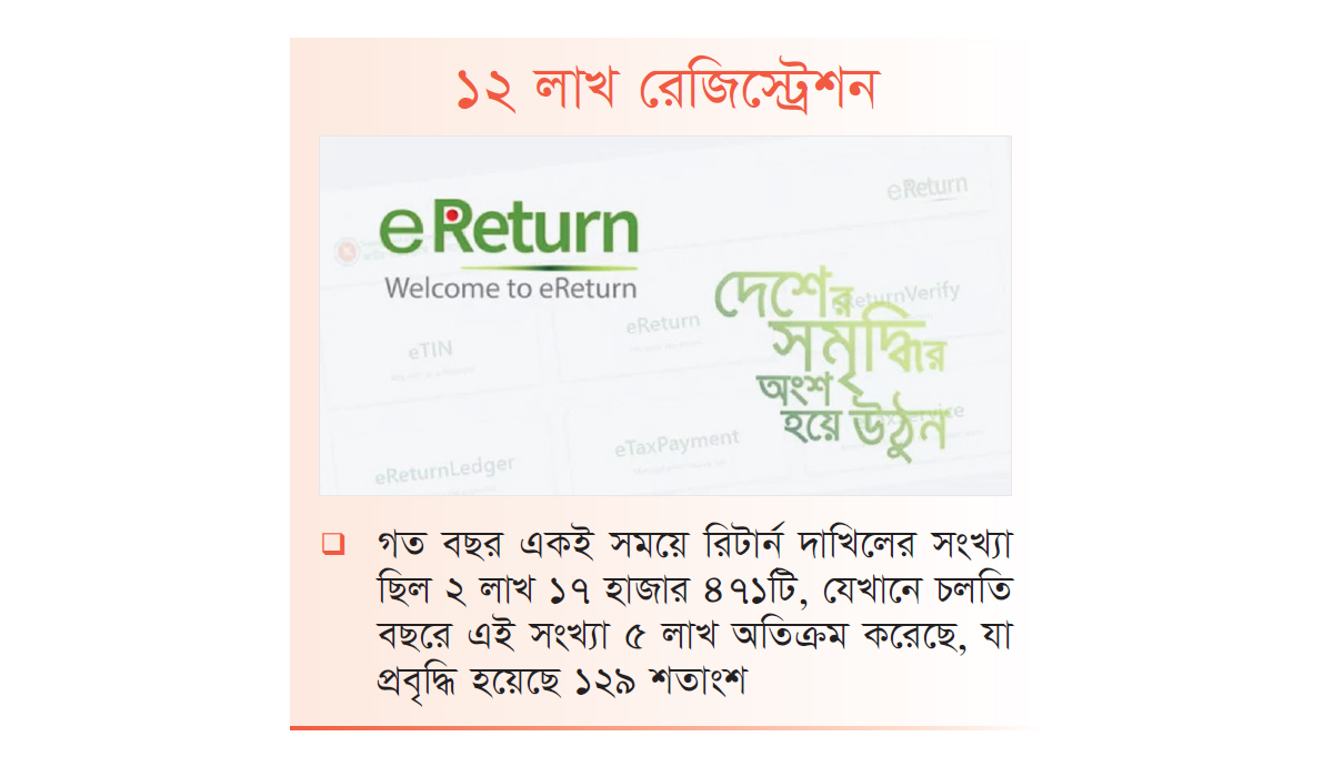 ২০২৪-২০২৫ করবর্ষে অনলাইনে আয়কর রিটার্ন দাখিলের সংখ্যা ৫ লাখ ছাড়িয়ে গেছে। একই সঙ্গে অনলাইনে রিটার্ন দাখিলের উদ্দেশ্যে ১২ লাখ ৫০ হাজার করদাতা রেজিস্ট্রেশন করেছেন। গত বছর একই সময়ে রিটার্ন দাখিলের সংখ্যা ছিল ২ লাখ ১৭ হাজার ৪৭১টি, যেখানে চলতি বছরে এই সংখ্যা ৫ লাখ অতিক্রম করেছে, যা প্রবৃদ্ধি হয়েছে ১২৯ শতাংশ। এনবিআরের পক্ষ থেকে এই সাফল্যের জন্য করদাতাদের ধন্যবাদ জানানো হয়েছে।
