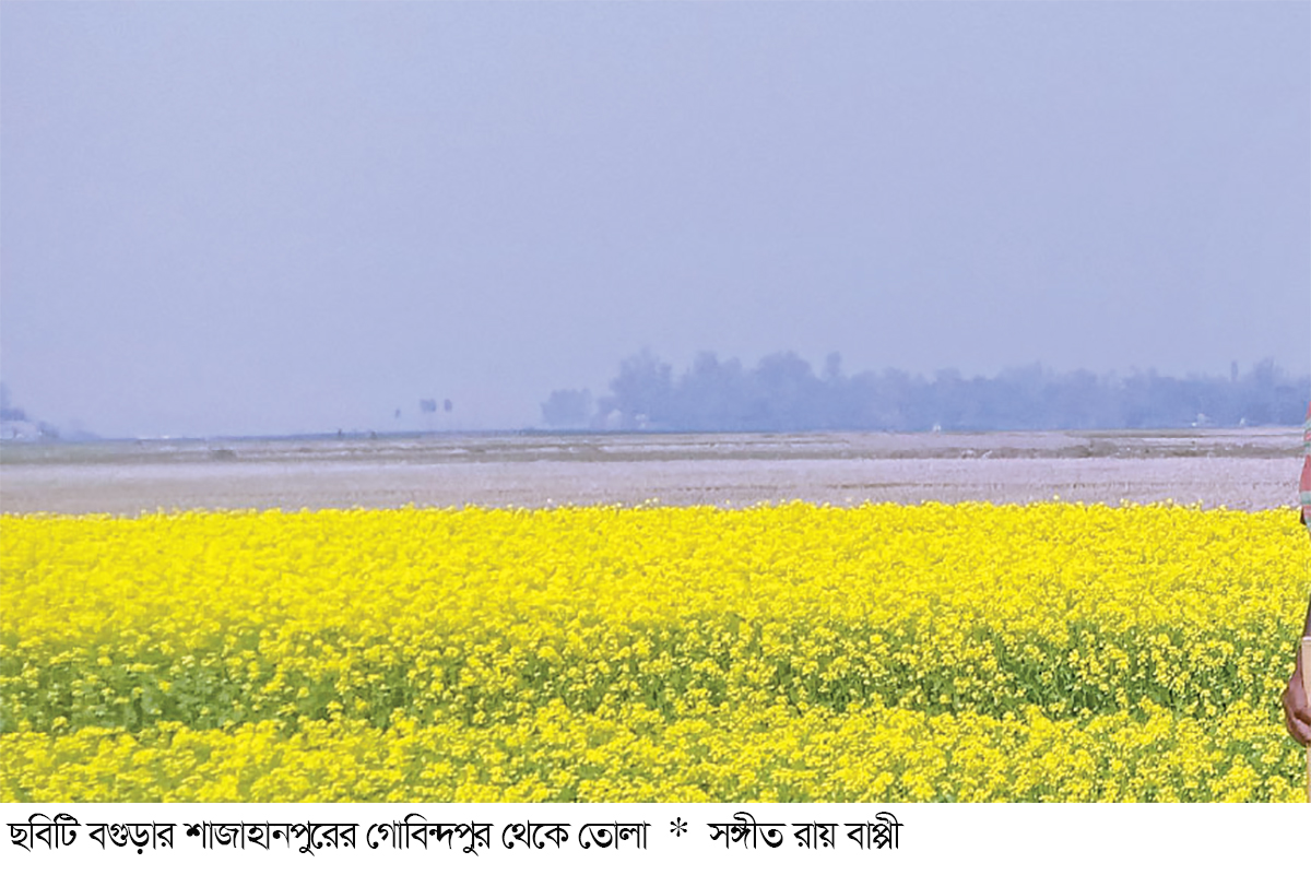 বগুড়ার মাঠে মাঠে শোভা পাচ্ছে সরিষার হলুদ ফুল। দিগন্তজোড়া মাঠে সরিষা ফুলের সমারোহের সৃষ্টি হয়েছে। জেলার প্রতিটি মাঠে মাঠে এখন সরিষা ফুলের ঘ্রাণ ছড়িয়েছে। এখন পর্যন্ত আবহাওয়া অনুকূলে থাকায় সরিষা চাষিরা বাম্পার ফলনের আশা করছে। জানা যায়, বগুড়ার উৎপাদিত বিভিন্ন সবজির সুনাম রয়েছে দেশজুড়ে। কিন্তু লাগাতার ধানের দাম না পাওয়ায় কৃষকরা ছুটছেন লাভজনক তেল জাতীয় ফসল সরিষা চাষের দিকে। কম খরচ, কম পরিশ্রম আর অল্প সময়ে সরিষা চাষ করা যায় বলে এটি অত্যন্ত লাভজনক একটি ফসল। প্রতি বিঘা জমি থেকে চলতি মৌসুমে গড় ৫ থেকে ৬ মণ হারে সরিষার ফলন পাওয়ার সম্ভাবনা রয়েছে। এছাড়াও সরিষা চাষ করলে জমির উর্বরতা শক্তি বৃদ্ধি পায় আর সরিষা তোলার পর বোরো ধান রোপণ করা সম্ভব। যার কারণে প্রতি বছরই সরিষার চাষ বৃদ্ধি পাচ্ছে। বগুড়ায় এবার লক্ষ্যমাত্রার চেয়ে বেশি আবাদ হয়েছে সরিষার। ভোজ্য তেল হিসেবে সরিষার তেলের চাহিদা বৃদ্ধির পাশাপাশি দাম বেশি হওয়ায় আগ্রহ বেড়েছে কৃষকদের। অন্যান্য ফসলের তুলনায় সরিষা চাষে কম খরচ, কম শ্রম এবং দ্রুত ফলন পাওয়া যায়। যে কারণে চাষিরা আবাদে লাভ বেশি পায়। জেলার পাঁচটি উপজেলায় সবচেয়ে বেশি সরিষা আবাদ করে থাকে কৃষকরা। হলুদ চাদরে বিছানো সরিষা ক্ষেতে সরিষা চাষি ও মৌ-চাষিরা এ মুহুর্তে ব্যস্ত সময় পার করছে। বগুড়ায় সরিষা চাষের বিপ্লব হওয়ায় দেশের সাতক্ষীর, সিরাজগঞ্জসহ দেশের বিভিন্ন জেলা মধু সংগ্রহকারী চাষিরা বগুড়ায় এসে ডেরা বসিয়েছে। সরিষা ক্ষেতের কোলঘেঁষে বসিয়েছে মৌমাছির বাক্স।