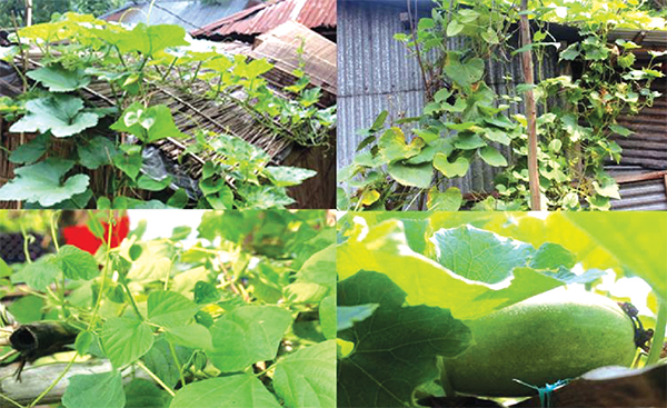 তিনি বলেন, আমি ঘরের এক পাশে চালকুমড়ার বীজ রোপণ করেছিলাম। চালকুমড়ার লতা এখন ঘরের চাল ছেয়ে গেছে। বেশ কয়েকটি চালকুমড়াও পেয়েছি। হাশেম আলী জানান, করোনার মধ্যে কৃষি অফিসের লোকজন এসে আমাদের এখানে বিনামূল্যে বিভিন্ন সবজির বীজ দিয়ে গিয়েছিল। আমি লাউ, চালকুমড়া, পুঁইশাকের বীজ নিয়েছিলাম। বাড়ির আঙিনায় সেগুলো চাষ করেছি। সকেরা খাতুন বলেন, আমি চালকুমড়া ও করলার বীজ পেয়েছিলাম। সেগুলো রোপণের পরে লতাগুলোকে আমি বাঁশের মাঁচা করে তুলে দিয়েছি। এরই মধ্যে আমি ১০-১৫টা কুমড়া পেঁয়েছি। করলা এখনো ধরেনি। তবে ফুল এসেছে।