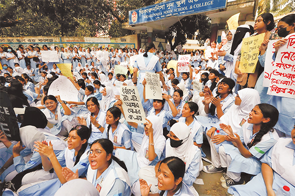 সারা দেশে ধর্ষণ ও নারী নিপীড়ন বন্ধের দাবিতে গতকাল ভিকারুননিসা নূন স্কুল এন্ড কলেজের প্রধান ফটকের সামনে বিক্ষোভ করেন প্রতিষ্ঠানটির শিক্ষার্থীরা * আলোকিত বাংলাদেশ