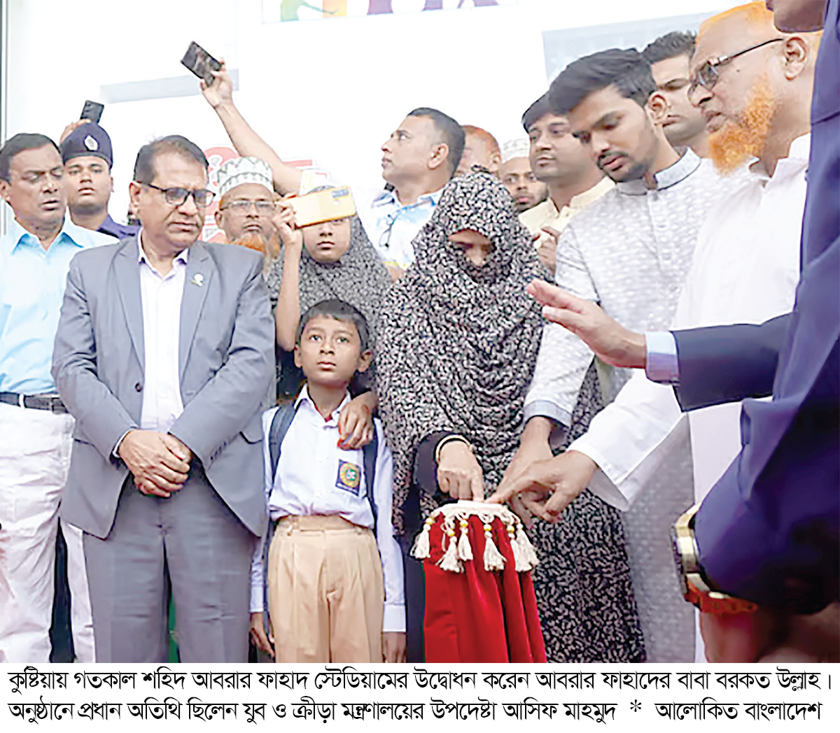 এর আগে দুপুর ১২টায় আসিফ মাহমুদের উপস্থিতিতে শহীদ আবরার ফাহাদের বাবা মো. বরকত উল্লাহ স্টেডিয়ামের উদ্বোধন করেন। এ সময় সেখানে আবরারের মা রোকেয়া খাতুন উপস্থিত ছিলেন। অনুষ্ঠানে সভাপতিত্ব করেন জেলা প্রশাসক তৌফিকুর রহমান। বিশেষ অতিথি ছিলেন যুব ও ক্রীড়া মন্ত্রণালয়ের সচিব রেজাউল মাকছুদ জায়েদী, জাতীয় ক্রীড়া পরিষদের সচিব (যুগ্ম সচিব) আমিনুল ইসলাম, কুষ্টিয়া পুলিশ সুপার মিজানুর রহমান প্রমুখ।