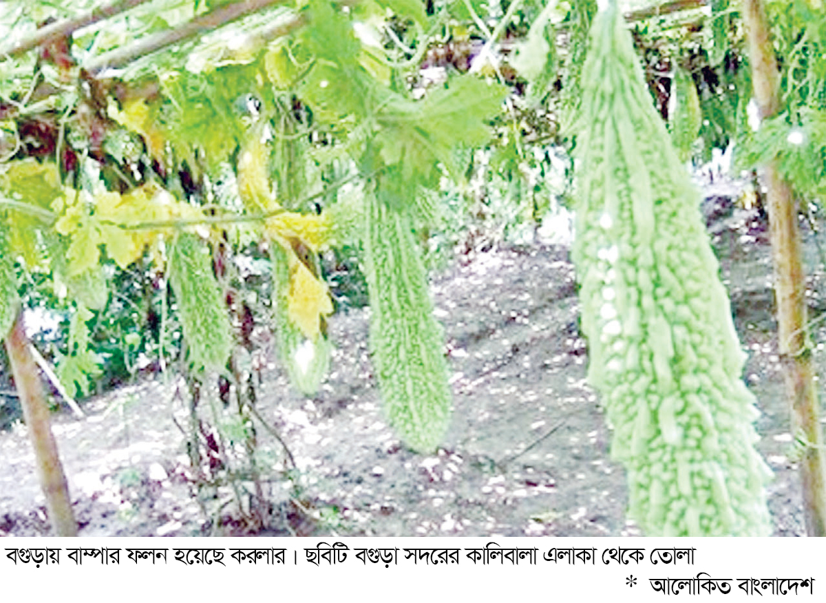 স্বল্প সময়ে অল্প খরচে লাভবান হওয়ায় প্রতি বছর বাড়ছে করলার চাষ। ভালো ফলন ও দাম পেয়ে কৃষকের মুখে হাসি ফুটেছে। জেলার চাহিদা মিটিয়ে দেশের বিভিন্ন স্থানে যাচ্ছে বগুড়ার করলা। এবারও লক্ষ্যমাত্রার চেয়ে বেশি উৎপাদনের আশা করছে কৃষি বিভাগ। সরেজমিন দেখা গেছে, জেলার বিভিন্ন এলাকায় খেতের মাচায় সবুজ গাছের মাঝে দুলছে করলা। কিছু করলা পেকে লাল হয়ে গেছে। প্রতিদিনই দুই বেলা সেই করলা জমি থেকে তুলে হাটে বাজারে নিয়ে যাচ্ছেন চাষিরা। বগুড়া সদর, শিবগঞ্জ, সোনাতলা, গাবতলী, সারিয়াকান্দি, শাজাহানপুর উপজেলায় স্থানীয় উন্নত জাতসহ বারি, হাইব্রিড জাতের করলা উৎপাদন হয়ে থাকে। বগুড়া সদরের কালিবালা এলাকার চাষি এরফান আলী জানান, বীজ বপনের ৪০ দিনের মধ্যেই গাছ থেকে করলা পাওয়া যায়, এক মাসেরও বেশি সময় ধরে করলা সংগ্রহ করা যায়। প্রতিবিঘা জমিতে ৬০ মণ পর্যন্ত ফসল পাওয়া যায়। প্রতি বিঘায় খরচ হয় ১৫ থেকে ২০ হাজার টাকা। বিক্রি করা যায় প্রায় লাখ টাকা। কৃষি বিভাগ জানান, করলা বা উচ্ছে স্বাদে তিতা হলেও পুষ্টিকর সবজি। বাজারে দামও কম নয়। তবে সারা বছরই বাজারে পাওয়া যায়। এর ওষুধি গুণ আছে। উচ্ছে বা করলা দেশের প্রায় সব জেলাতেই চাষ হয়। আগে গরমকালে বা খরিপ মৌসুমে উচ্ছে বা করলা চাষ হতো। তবে এখন সারাবছরই চাষ করা যায়। সুনিষ্কাশিত জৈব পদার্থযুক্ত দোআঁশ ও বেলে-দোআঁশ মাটি উচ্ছে বা করলা চাষের জন্য ভালো। ছায়াযুক্ত জায়গায় ভালো হয় না। পানি জমে না এ ধরনের প্রায় সব রকমের মাটিতেই চাষ করা যায়। বাংলাদেশের আবহাওয়া উচ্ছে বা করলা চাষের জন্য উপযোগী। উষ্ণ ও আর্দ্র আবহাওয়ায় উচ্ছে ভালো জন্মায়। উচ্ছে উষ্ণ ও আর্দ্র জলবায়ু উপযোগী ফসল। এটি বৈরি পরিবেশ সহিষ্ণু উদ্ভিদ। মোটামুটি শুষ্ক আবহাওয়াতেও এর ফলন সম্ভব। উচ্ছে বা করলা জলাবদ্ধতা সহ্য করতে পারে না। আবার অতিরিক্ত বৃষ্টিপাতে পরাগায়ন বিঘ্নিত হতে পারে। বছরের যে কোনো সময়ে উচ্ছে বা করলা লাগানো যায়। তবে খরিপ মৌসুমে অর্থাৎ গ্রীষ্ম ও বর্ষাকালে এ সবজি ভালো হয়। বীজ বপন করার আগে মাটি ভালোভাবে পানি দিয়ে ভিজিয়ে নিয়ে ১৫-২০ দিন বয়সের চারা পরের দিন বিকালে রোপণ করতে হবে। চারা মাটির দলাসহ লাগাতে হবে। তারপর গর্তে পানি দিতে হবে। উচ্ছে বা করলার সবচেয়ে ক্ষতিকর পোকা হলো ফল ছিদ্রকারী পোকা। এই পোকার হাত থেকে রক্ষা পেতে হলে মাঝে মাঝে করলা গাছে ভালো কীটনাশক স্প্রে করতে হবে।