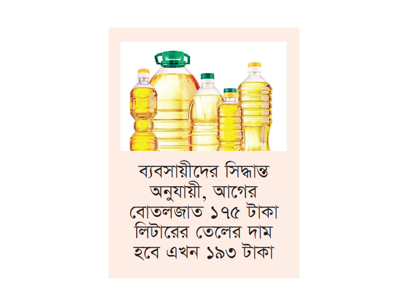 ব্যবসায়ীদের সিদ্ধান্ত অনুযায়ী, আগের বোতলজাত ১৭৫ টাকা লিটারের তেলের দাম হবে এখন ১৯৩ টাকা। এছাড়া খোলা সয়াবিন ও পাম তেল প্রতি লিটারে ১০ টাকা বাড়বে। বোতলজাত সয়াবিনের দাম সর্বশেষ গত ৯ ডিসেম্বর বাড়ানো হয়েছিল। তখন লিটারপ্রতি দাম নির্ধারণ করা হয় ১৭৫ টাকা। আগামী ১ এপ্রিল থেকে প্রতি লিটার বোতলজাত সয়াবিনের দাম নির্ধারণ করা হয়েছে ১৯৩ টাকা। সেই হিসাবে লিটারে দাম বাড়ছে ১৮ টাকা। পাঁচ লিটারের বোতলজাত সয়াবিনের দাম নির্ধারণ করা হয়েছে ৯৩৫ টাকা। একই ভাবে খোলা সয়াবিন ও খোলা পাম তেলের দাম নির্ধারণ করা হয়েছে লিটারপ্রতি ১৭০ টাকা। এখন সরকার নির্ধারিত দাম লিটারপ্রতি ১৫৭ টাকা। এ হিসাবে খোলা সয়াবিন ও পাম তেলের দাম বাড়ছে লিটারপ্রতি ১৩ টাকা।