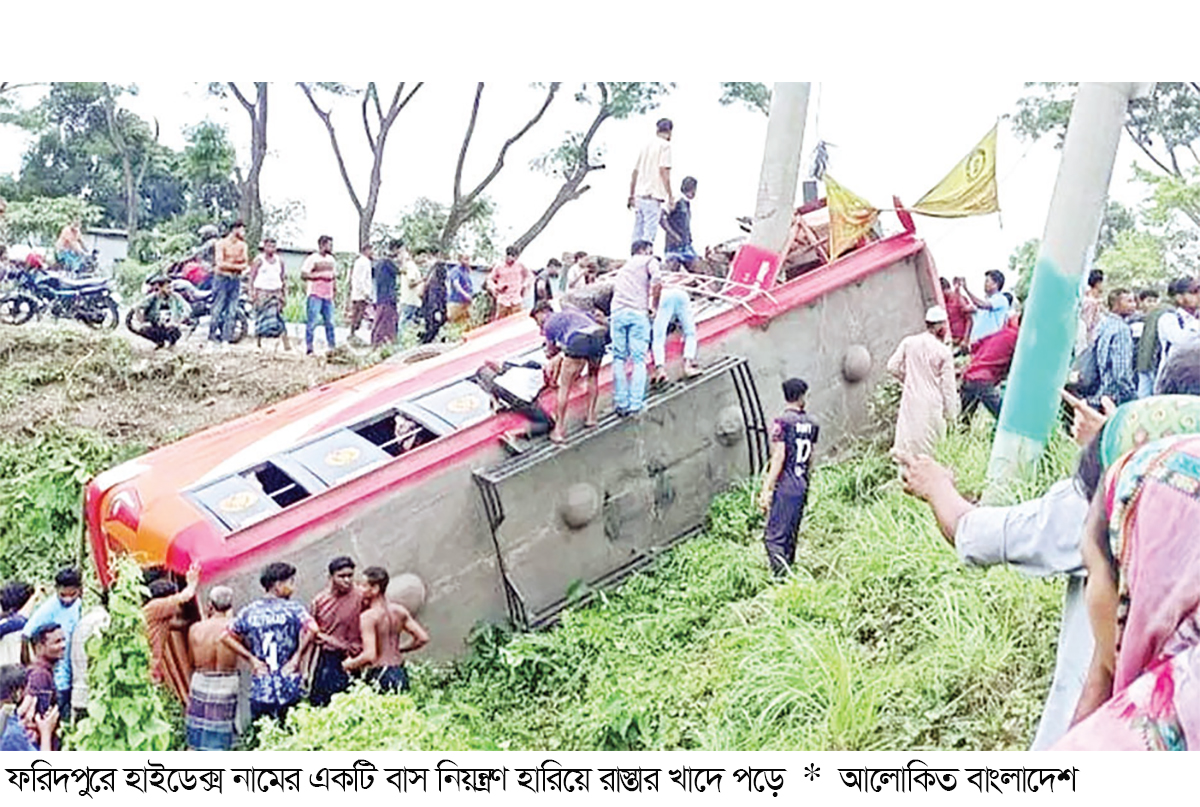 ফরিদপুরে নিয়ন্ত্রণ হারিয়ে বাস উল্টে সাতজনের মৃত্যু হয়েছে। এই ঘটনায় আহতরা ফরিদপুর মেডিকেল কলেজ হাসপাতালে চিকিৎসাধীন। আহত ৩৫ জনের মধ্যে ১২ জনের অবস্থা আশঙ্কাজনক। নিহতরা হলেন- ফরিদপুরের নগরকান্দা উপজেলার কোদালিয়া শহীদনগর ইউনিয়নের শেখরকান্দি গ্রামের বাসিন্দা জোয়ার সরদার, তার ছেলে ইমান সরদার, নগরকান্দার কাঠিয়া বড়গ্রামের বাসিন্দা রাজীব খানের স্ত্রী দীপা খান, ফরিদপুর সদরের চর চাঁদপুর গ্রামের বলরাম সরকারের স্ত্রী ভারতি সরকার, চরভদ্রাসন উপজেলার গাজীটেক গ্রামের বাসিন্দা খালেক চৌধুরীর ছেলে আলম চৌধুরী, ফরিদপুর শহরের গোয়ালচামট মহল্লার বাসিন্দা লতিফ ব্যাপারির স্ত্রী ফজিরন নেসা এবং লালমনিরহাটের হাতিবান্ধা উপজেলার পূর্ব ফকিরপাড়া গ্রামের জহিরউদ্দিনের ছেলে আজিবরউদ্দিন। গতকাল মঙ্গলবার বেলা ১১টার দিকে ঢাকা-বরিশাল মহাসড়কের জেলা সদরের বাখুন্ডা এলাকায় এ দুর্ঘটনা ঘটে। পুলিশ ও স্থানীয় সূত্রে জানা যায়, মুকসুদপুর থেকে ফরিদপুরের উদ্দেশ্যে ছেড়ে আসা ফারাবি পরিবহন নামে একটি লোকাল বাস বাখুন্ডা এলাকায় পৌঁছালে নিয়ন্ত্রণ হারিয়ে সড়কের পাশে থাকা একটি বিদ্যুতের খুঁটির সঙ্গে ধাক্কা লেগে উল্টে খাদে পড়ে যায় এবং উক্ত দুর্ঘটনা ঘটে। এসময় বিদ্যুতের একটি পিলার প্রায় সাত থেকে আট ফিট বাসের ভেতরে ঢুকে যায়। ফরিদপুর ফায়ার সার্ভিস স্টেশনের টিম লিডার সাইফুল ইসলাম জানান, আমরা খবর পেয়ে ৫ জনকে মৃত অবস্থায় এবং বাকিদের আহত অবস্থায় উদ্ধার করি। আহতদের ফরিদপুর মেডিকেল কলেজ হাসপাতালে আনা হয় এবং আহতদের মধ্যে দুইজন ফরিদপুর মেডিকেল কলেজ আনার পরে মৃত্যু হয়েছে। ফরিদপুর হাইওয়ে পুলিশের সহকারী পুলিশ সুপার মো. মারুফ হোসেন জানান, গাড়িটি দ্রুত গতির ছিল। একইসঙ্গে আরেকটি দ্রুত গতির কোনো যানকে ওভারটেকিং করতে গিয়ে নিয়ন্ত্রণ হারিয়ে এ দুর্ঘটনা ঘটেছে বলে প্রাথমিকভাবে ধারণা করা হচ্ছে। ফরিদপুর সদর উপজেলা নির্বাহী কর্মকর্তা (ইউএনও) ইশরাত জাহান বলেন, আমি ঘটনাস্থল পরিদর্শন করেছি। প্রত্যক্ষদর্শীদের সঙ্গে কথা বলেছি। তারা জানিয়েছেন বাসের গতি ৮০ কিলোমিটারের বেশি ছিল। চালকের বেপরোয়া গতির কারণে এ দুর্ঘটনা ঘটেছে। এ ব্যাপারে জেলা বাস ও মিনিবাস মালিক সমিতির সঙ্গে সভা করা হবে। ফরিদপুরের জেলা প্রশাসক মো. কামরুল হাসান মোল্লা বলেন, নিহত প্রত্যেককে প্রশাসনের উদ্যোগে ২৫ হাজার টাকা দেয়া হচ্ছে। এছাড়া পরবর্তিতে বিআরটিএর মাধ্যমে এককালীন অনুদান দেয়া হবে। এ ঘটনায় অতিরিক্ত জেলা ম্যাজিস্ট্রেটকে আহ্বায়ক করে পাঁচ সদস্যবিশিষ্ট একটি তদন্ত কমিটি গঠন করা হয়েছে। এই কমিটি দুর্ঘটনার কারণ অনুসন্ধান করবে। পরে তাদের সুপারিশ অনুযায়ী ব্যবস্থা নেয়া হবে।