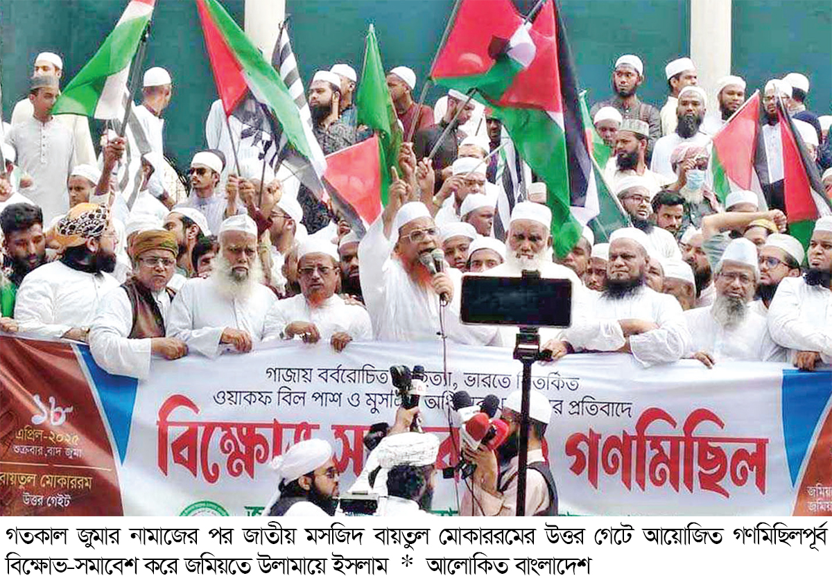 শুক্রবার (১৮ এপ্রিল) বাদ জুমা জাতীয় মসজিদ বায়তুল মোকাররমের উত্তর গেটে আয়োজিত গণমিছিলপূর্ব বিক্ষোভ সমাবেশে জমিয়ত মহাসচিব এসব কথা বলেন। গাজায় অব্যাহত গণহত্যা, ভারতে বিতর্কিত ওয়াকফ বিল পাস ও মুসলিম অধিকার খর্ব করার প্রতিবাদে আয়োজিত এই বিক্ষোভ সমাবেশে সভাপতিত্ব করেন দলের অন্যতম সহ-সভাপতি মাওলানা আব্দুর রব ইউসুফী।