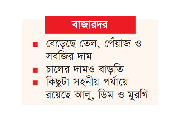শীত মৌসুম শেষ হয়েছে আরও আগে। বাজারে আসতে শুরু করেছে বিভিন্ন ধরনের গ্রীষ্মের সবজি। তবে এসব সবজির দাম তুলনামূলক বেশি। একই সঙ্গে তেল, চাল, পেঁয়াজের দামও বাড়তি। এক কথায় নিত্যপণ্যগুলোর দাম দিন দিন বেড়েই চলছে। গতকাল শুক্রবার রাজধানীর বিভিন্ন বাজার ঘুরে ও বিক্রেতাদের সঙ্গে কথা বলে এসব তথ্য জানা গেছে। বিক্রেতারা জানান, বেশ কিছুদিন ধরে বাজারে বাড়তি দামে বিক্রি হচ্ছে সবজি। দাম বেড়েছে দেশি পেঁয়াজেরও। গতকাল এক কেজি দেশি পেঁয়াজ বিক্রি হয়েছে ৫০ থেকে ৫৫ টাকা দরে। গত সপ্তাহের শুরুতে প্রতি কেজি পেঁয়াজ ৩৫ থেকে ৪০ টাকায় বিক্রি হয়েছে। এদিকে গত মাসে মিনিকেট চালের দাম কেজিতে পাঁচ থেকে আট টাকা বেড়েছিল। সেই দাম কমেনি; বরং দুই সপ্তাহের ব্যবধানে আরও দুই থেকে তিন টাকা করে বেড়েছে।