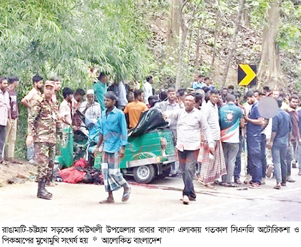 রাঙামাটি-চট্টগ্রাম সড়কের কাউখালী উপজেলার বেতবুনিয়া ইউনিয়নের রাবার বাগান এলাকায় সিএনজিচালিত অটোরিকশা ও পিকআপের মুখোমুখি সংঘর্ষের ঘটনায় গুরুতর আহত আরও একজনের মৃত্যু হয়েছে। এতে এ ঘটনায় সিএনজি অটোরিকশাতে থাকা সব যাত্রী ও চালকসহ মোট ছয়জন নিহত হয়েছেন।