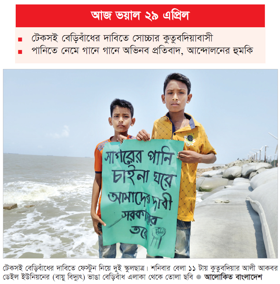 গত শনিবার ২৬ এপ্রিল বেলা ১১টায় বিচ্ছিন্ন দ্বীপ উপজেলার কুতুবদিয়ার আলী আকবর ডেইল ইউনিয়নের বায়ুবিদ্যুৎ লাগোয়া ভাঙা বেড়িবাঁধ এলাকায় ফেস্টুন হাতে নিয়ে দাঁড়ান সুনাম কুমার শীল (১৪) ও দীপঙ্কর শীল রকি (১১)। ‘সাগরের পানি চাই না ঘরে, আমাদের দাবি সরকারের তরে’ স্লোগানে একটি ফেস্টুন ওই দুই শিশুর হাতে ছিল। তারা দুজনই আলী আকবর ডেইল ইউনিয়নের বাসিন্দা নয়। তবুও প্রায় দুই কিলোমিটার হেঁটে টেকসই বেড়িবাঁধের দাবিতে বড়ঘোপ এলাকা থেকে বায়ুবিদ্যুৎ ভাঙা বেড়িবাঁধ এলাকায় এসেছেন তারা।
