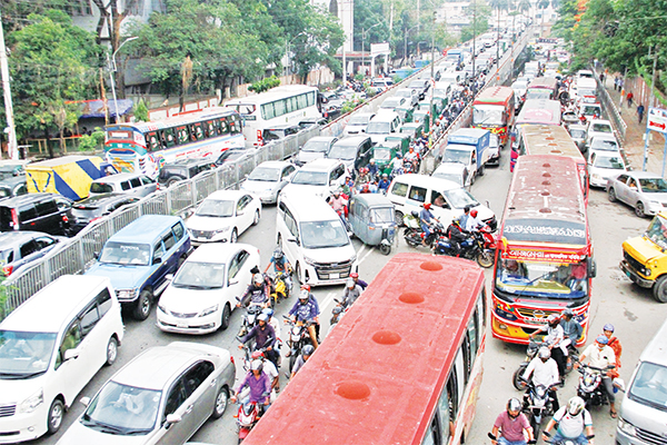 রাজধানীতে হঠাৎ নামে স্বস্তির বৃষ্টি। এরপর শুরু হয় অসহনীয় যানজট। ছবিটি গতকাল তেজগাঁও সাতরাস্তা থেকে তোলা * আলোকিত বাংলাদেশ