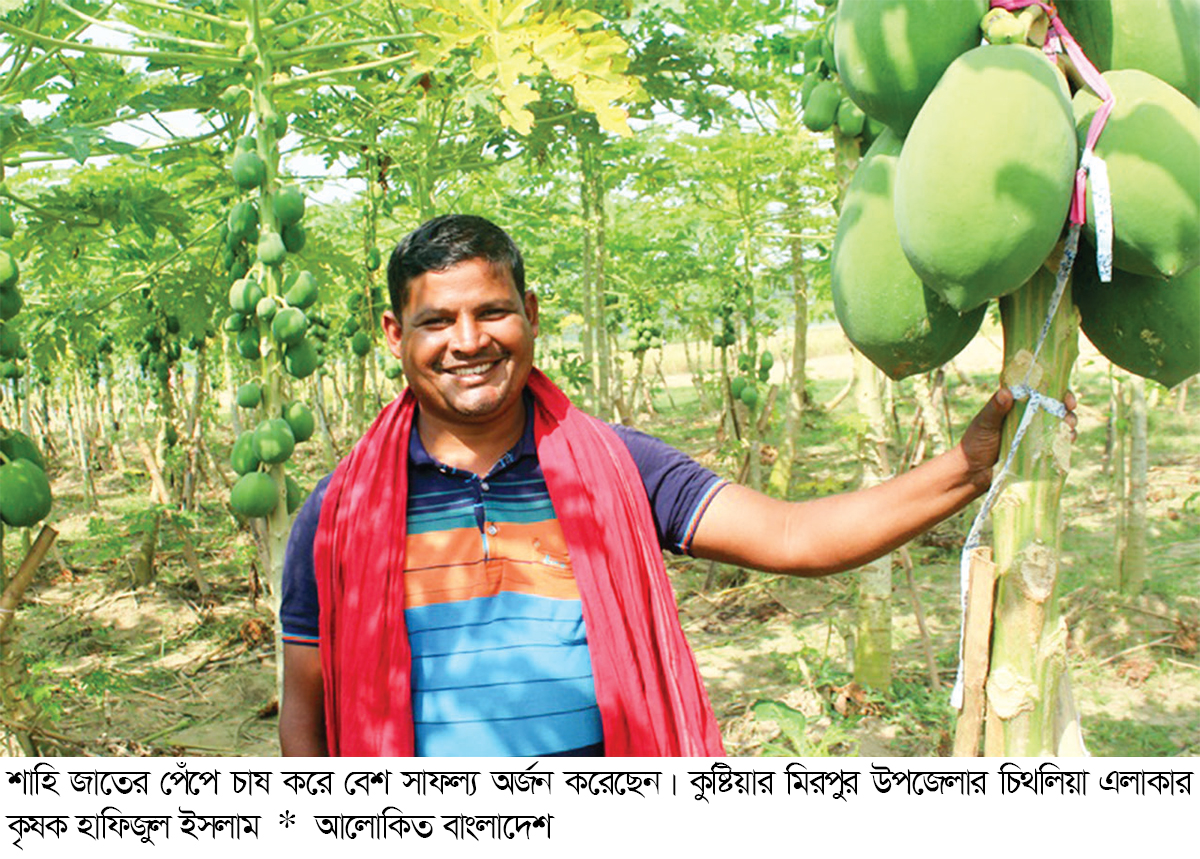 কুষ্টিয়ার মিরপুর উপজেলার চিথলিয়া এলাকার কৃষক হাফিজুল ইসলাম। ৯ম শ্রেণির গণ্ডি পেরিয়ে ইতি হয় লেখাপড়ার। তারপর থেকে কৃষিকাজের সঙ্গে জড়িয়ে পড়েন তিনি। কৃষি অফিসের পরামর্শে এ বছর শাহি জাতের পেঁপে চাষ করে বেশ সাফল্য অর্জন করেছেন তিনি। মাত্র ১ বিঘা জমিতে ১ লাখ টাকার পেঁপে বিক্রয় করে এলাকার কৃষকদের মাঝে সাড়া ফেলেছেন তিনি। হাফিজুল এখন এলাকার অন্য চাষিদের কাছে মডেল। তার পুরো বাগানটি যেন চোখ জোড়ানো এক খেত। গাছের মাঝ থেকে ডগা পর্যন্ত ছোট, মাঝারি, বড় আকারের পেঁপে ধরে রয়েছে। হাফিজুলের সাফল্য দেখে অনেকেই আগ্রহ দেখাচ্ছেন এই পেঁপেচাষে। গতকাল সোমবার সকালে হাফিজুলকে দেখা যায় তার পেঁপের বাগানে কাজ করতে। পুরো বাগানঘুরে দেখা যায়, এ যেন গাছে টাকা ধরে রয়েছে। এক একটি গাছে প্রচুর পরিমাণে পেঁপে। ৪ দিন আগেও তিনি ৬০ মণ পেঁপে বিক্রি করেছেন তার ২২ কাঠা জমির পেঁপে বাগান থেকে। কথা হয় হাফিজুলের সঙ্গে। তিনি জানান, ‘৫ ভাইয়ের মধ্যে সবার ছোট ছিলাম আমি। পরিবারের টাকার অভাবে লেখাপড়া করতে পারিনি। মাঠের চাষাবাদ শুরু করি। তার পরে এলাকার অন্য চাষিদের মতো তামাকের চাষ শুরু করি। এক সময় দেখি, তামাকে একসঙ্গে টাকা পাওয়া যায় ঠিকই; কিন্তু প্রচুর কাজ করতে হয়। আর বাড়ির সকলে মিলে এত কাজের পরেও বিক্রি করলে খুব একটা লাভ হয় না।‘