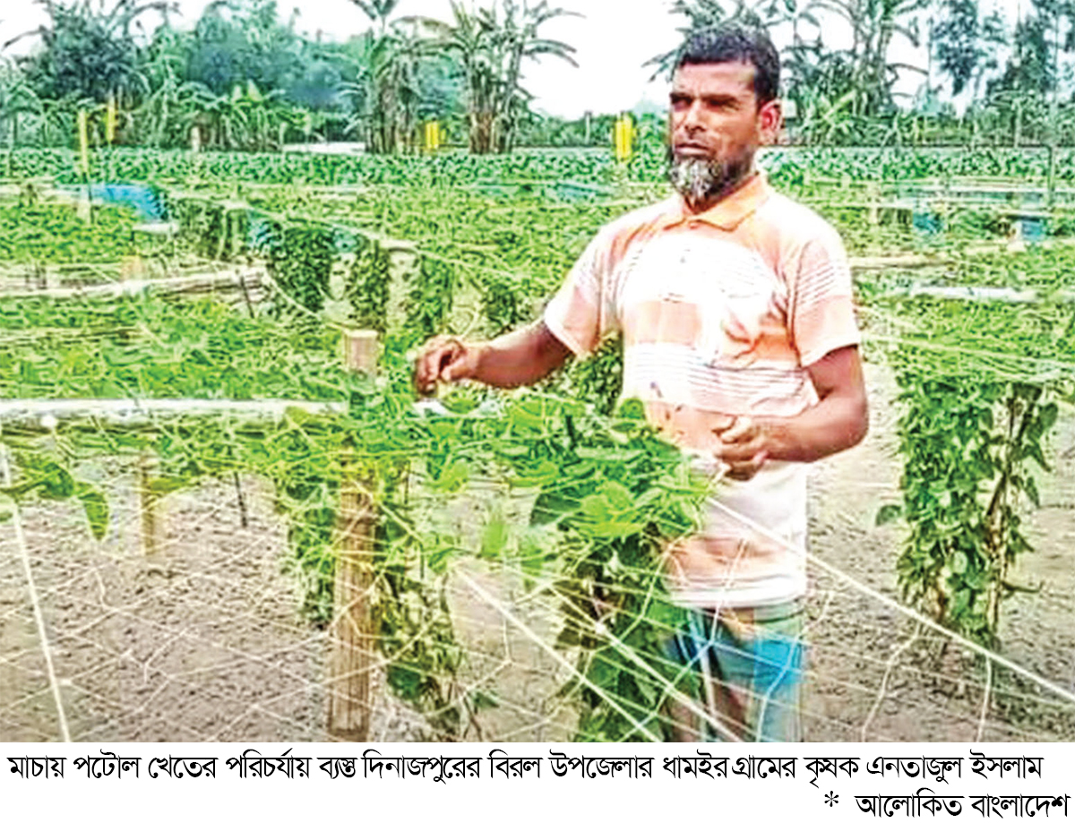 দিনাজপুরের বিরল উপজেলার ধামইর গ্রামে মাচায় পটোল চাষ করে ব্যাপক সফলতা পেয়েছেন কৃষি উদ্যোক্তা এনতাজুল ইসলাম। প্রথমবারেই পটোল চাষে অধিক লাভ হওয়ায় এনতাজুলের মুখে ফুটেছে হাসি। পটোল চাষ করে যথেষ্ট সাড়া ফেলেছেন এই কৃষি উদ্যোক্তা। তার সফলতা দেখে উৎসাহিত হচ্ছেন অনেক কৃষক। আর এই পটোল চাষে কৃষকদের উৎসাহিত করতে কাজ করছে কৃষি বিভাগও।