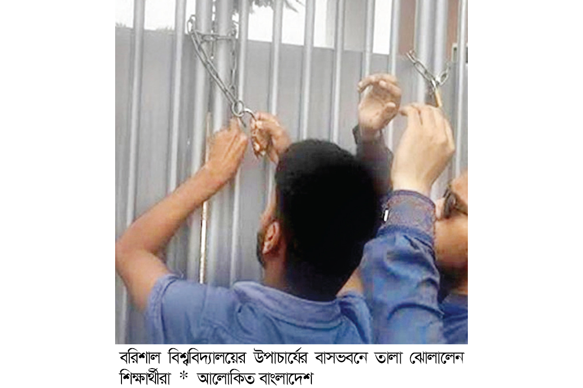 বরিশাল বিশ্ববিদ্যালয় (ববি) উপাচার্য প্রফেসর ড. শুচিতা শরমিনের পদত্যাগের এক দফা দাবিতে অবস্থান কর্মসূচি পালন করছেন বিক্ষোভরতরা। এরপর বিক্ষোভ মিছিল নিয়ে উপাচার্যের বাসভবনের প্রধান গেটে তালা ঝুলিয়ে দেয় তারা। গতকাল বুধবার বেলা দুপুর ১২টায় বিশ্ববিদ্যালয়ের প্রশাসনিক ভবনের গ্রাউন্ড ফ্লোরে অবস্থান নিয়ে বিক্ষোভে ফেটে পড়েন শিক্ষার্থীরা। তাদের দাবি একটাই উপাচার্যের পদত্যাগ। উপাচার্য পদত্যাগ অথবা অপসারণ না হওয়া পর্যন্ত আন্দোলন চালিয়ে যাওয়ার ঘোষণা দেন তারা। এরপর বিক্ষোভ মিছিল নিয়ে ক্যাম্পাসের মধ্যে থাকা উপাচার্যের বাসভবনের প্রধান গেটে তালা ঝুলিয়ে দেয় বিক্ষোভরতরা। সাধারণ শিক্ষার্থীরা আন্দোলনে নেই কেন? এর জবাবে নেতৃত্বদানকারী সুজয় শুভ বলেন, ‘এ মুহূর্তে বেশিরভাগ ডিপার্টমেন্টের পরীক্ষা চলমান। এ কারণে তারা আন্দোলনে আসতে পারছে না। কিন্তু সাধারণ শিক্ষার্থীরা এ আন্দোলনের সঙ্গে একাত্মতা প্রকাশ করেছে। আর আমরা যারা আন্দোলনে রয়েছি তারা একাডেমিক কার্যক্রমে কোনো ধরনের বাধা না দেওয়ার জন্য বলা হয়েছে।’ সাধারণ শিক্ষার্থীরা তাদের পরীক্ষা শেষ করে প্রতিদিন অবস্থান কর্মসূচিসহ উপাচার্যের পদত্যাগের আন্দোলনে সম্পৃক্ত হচ্ছেন। তারা কোনোভাবেই এ আন্দোলন থেকে সরবেন না বলে সাফ জানিয়ে দেন। উপাচার্যের পদত্যাগই আন্দোলন থেকে শিক্ষার্থীদের ক্লাসে পাঠানোর একমাত্র পথ বলে তিনি উল্লেখ করেন। গত মঙ্গলবার দুপুর ১২টার পর থেকে প্রশাসনিক কার্যক্রম শাটডাউন ঘোষণা করেন শিক্ষার্থীরা। এ কারণে প্রশাসনিক দফতরগুলোতে আজ কর্মকর্তা-কর্মচারীরা প্রবেশ করতে পারেননি। দীর্ঘক্ষণ গ্রাউন্ড ফ্লোরের সামনে ঘোরাঘুরি করে তারা বাসায় ফিরতে বাধ্য হন। চার দফা দাবি নিয়ে দীর্ঘ ১৮ দিন আন্দোলন-সংগ্রাম চালিয়ে গেলে ভিসির পক্ষ থেকে বৈঠকে না বসায় পরবর্তীতে ওই আন্দোলন চলে যায় এক দফা দাবিতে। ওই এক দফা দাবিতে প্রতিদিন অবস্থান কর্মসূচিসহ বিভিন্ন কর্মসূচি পালন করছেন শিক্ষার্থীরা। তবে একাডেমিক কার্যক্রমে কোনো বাধা দিচ্ছেন না আন্দোলনরতরা।