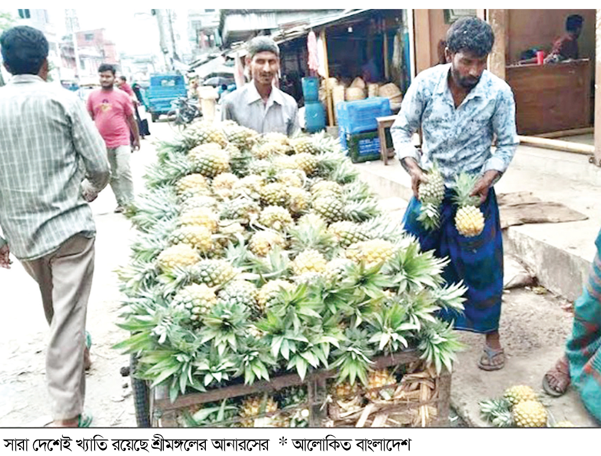 বিশাল পাহাড় ও উঁচু-নিচু টিলায় বিভিন্ন মৌসুমি ফসলে পরিপূর্ণ প্রকৃতির রূপসীকন্যা মৌলভীবাজারের শ্রীমঙ্গল। এখানে চায়ের পাশাপাশি কাঁঠাল, আনারস ও লেবুর সুখ্যাতি রয়েছে দেশজুড়ে। দেশের চাহিদা পূরণে সবচেয়ে বেশি আনারস আম, কাঁঠালসহ বিভিন্ন ফল উৎপন্ন হয় শ্রীমঙ্গলের পাহাড়ি ভূমিতে। এই উপজেলার আনারস সারাদেশ সুপ্রসিদ্ধ এবং স্বাদে-গন্ধে অতুলনীয়। এ মধুমাসে বাজারজুড়ে অন্য ফলের সঙ্গে শ্রীমঙ্গলের আনারস জেলার গণ্ডি ছাড়িয়ে চলে যাচ্ছে দেশের বিভিন্ন প্রান্তে। শ্রীমঙ্গলের চাষিরা জানান, এখানকার পাহাড়ি উঁচু-নিচু টিলায় ষাটের দশক থেকে আনারস চাষ শুরু হয়েছিল। এখানকার উষ্ণ ও আর্দ্র জলবায়ু আনারস চাষের জন্য খুবই উপযোগী। এখানে বারো মাস আনারসের চাষ করা হয়। এলাকার চাহিদা মিটিয়ে সারা বছর দেশের বিভিন্ন জায়গায় পাঠানো হয় শ্রীমঙ্গলের আনারস। আনারস সুস্বাদু ও পুষ্টিকর ফল। তার সঙ্গে এটি গুরুত্বপূর্ণ অর্থকরী ফসল।