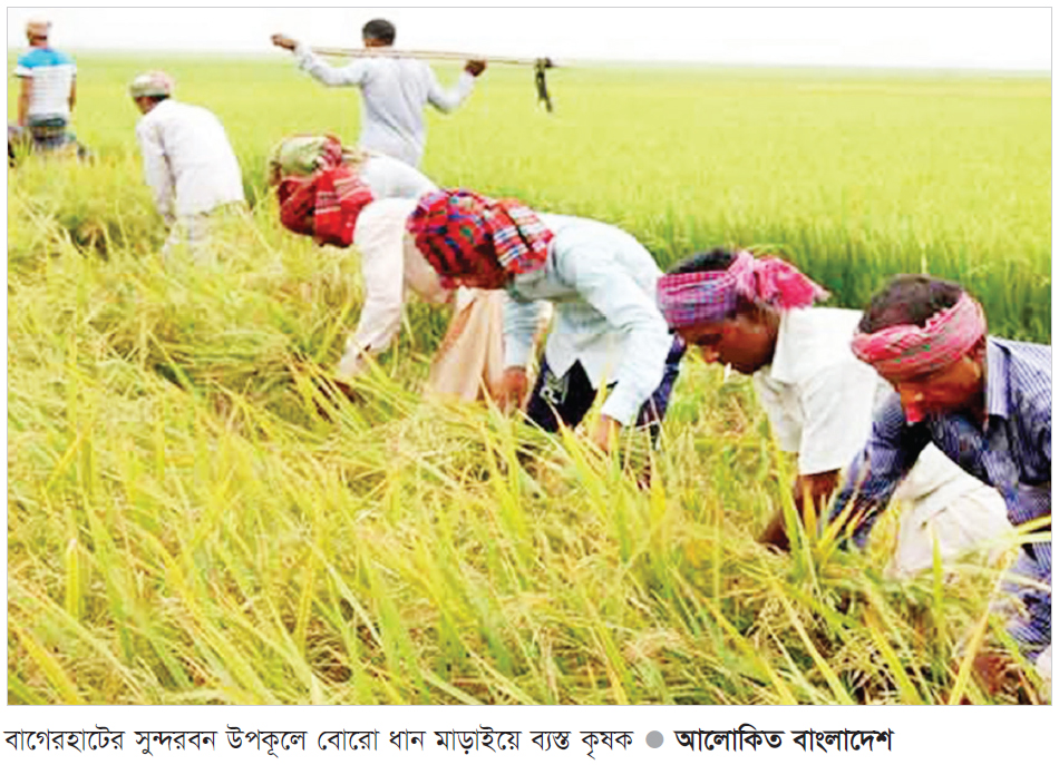 সুন্দরবনের উপকূলের বাগেরহাটের মোরেলগঞ্জ শরণখোলায়সহ ৯ উপজেলায় বোরো ধানের বাম্পার ফলন হয়েছে। প্রতি বিঘা জমিতে ১৬ থেকে ২০ মণ ধান ঘরে তুলতে পারবে কৃষক। বাগেরহাট সদরের-খানপুর, সায়ড়া, সদুল্যাপুর শ্রীঘাট, রনজিতপুর, চুলকাটি, রাখালগাছি, মগরা, বাদুখালী, বাগমারা জুয়ারিকুল, পোলঘাট, মাঝিডাঙ্গা যাত্রাপুর ও ফকিরহাট উপজেলার-লখপুর, ভট্টখামার, মৌভোগ, পিলজঙ্গসহ সদর উপজেলা জেলার বিভিন্ন এলাকার বাম্পার ফসল হয়েছে। কৃষকরা জানান, বিগত ১০ বছরের তুলনায় চলতি মৌসুমে বাগেরহাটে বোরো ধানের বাম্পার ফসল ফলন হয়েছে। এ বছর পর্যাপ্ত সার এবং ওষুধের পাশাপাশি সেচের জন্য বিদ্যুৎ ঠিকমতো পাওয়ায় বোরো ধান উৎপাদনে কোনো সমস্যা হয়নি। পহেলা বৈশাখ অর্থাৎ নতুন বছর থেকেই আগাম জাতের বোরো ধান কাটা শুরু হয়েছে। শেখ মারুফ বিল্লাহ আহমেদ বলেছেন, আমি চাকরির ফাঁকে ৩২ শতক জমিতে ধান চাষ করেছি। ফলন ভালো হয়েছে। আগাম জাতের বোরো ধান আবাদ করেছিলাম, এক সপ্তাহ আগে ধান কাটা শেষ করেছি। শাহরিয়ার আলম শাওন বলেন, ৩ বিঘা জমিতে ১২০ থেকে ১৪০ মণ ধানের ফলন হয়েছে। এ বছর যেভাবে ধানের ফলন হয়েছে, তাতে ঠিকমতো ঘরে তুলতে পারলে; কৃষকদের গোলা ধানে পরিপূর্ণ হবে। ধান ও চালের অভাব থাকবে না। বাগেরহাটের মোরেলগঞ্জ শরণখোলাসহ ৯ উপজেলায় বোরো ধানের বাম্পার ফলন হয়েছে। প্রতি বিঘা জমিতে ১৬ থেকে ২০ মণ ধান ঘরে তুলতে পারবে কৃষক। বোরো ধান কর্তন প্রায় শেষের পথে। ফলনও ভালো হয়েছে। মাথায় অথবা ভ্যানে করে ধান বহন ও মাড়াই কাজে কৃষক, কৃষানি ও ক্ষেতমজুররা ব্যস্ত সময় পার করছেন। ফড়িয়ারা বাড়ি-বাড়ি ঘুরে ধান কিনছেন। বিক্রি শুরু হয়েছে হাটেও। সম্প্রতি ফড়িয়ারা সিন্ডিকেট করে ধানের দাম কমিয়ে দিয়েছেন। অবস্থাপন্ন কৃষকরা আপাতত ধান বিক্রি না করলেও গরিব চাষিরা ধার-দেনা মেটাতে এবং সংসার খরচ চালাতে স্বল্প দামে ধান বিক্রি করতে বাধ্য হচ্ছেন।