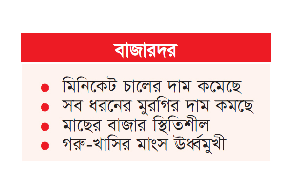 তিনি বলেন, গত ঈদের পর থেকে বাজারে মাছের দামটাও একটু বেশি। তবে অন্যদিনের তুলনায় আজ একটু কম মনে হয়েছে। আবার ব্রয়লার মুরগির দামও দেখলাম দাম অনেকটা কম। মাংস বিক্রেতারা বলছেন, কোরবানির বাজারে ভালো দামের আশায় সারা দেশের মানুষ এখন গরু বিক্রি কমিয়ে দিয়েছেন, যারাও বিক্রি করছেন তাদের কাছ থেকে বেশি দাম দিয়ে কিনতে হচ্ছে। পুরনো চালের দাম উচ্চমূল্যে স্থিতিশীল থাকলেও বাজারে নতুন আসা মিনিকেট চাল তুলনামূলক কম দামে বিক্রি হচ্ছে। বাজার ঘুরে দেখা গেছে, বর্তমানে খুচরা দোকানে ডায়মন্ড, মঞ্জুর, সাগর ও রসিদ প্রভৃতি ব্র্যান্ডের নতুন মিনিকেট চাল ৭৫ থেকে ৭৬ টাকা কেজি বিক্রি হচ্ছে। মিনিকেটের মধ্যে মোজাম্মেল ব্র্যান্ডের চালের দাম অবশ্য আরেকটু বেশি। প্রতি কেজি মোজাম্মেল চাল এখন ৮২-৮৪ টাকায় বিক্রি হয়। মাসখানেক আগে এই চালের কেজি ১০০ টাকার আশপাশে ছিল। অন্যান্য চালের মধ্যে মানভেদে নাজিরশাইল ৮০ থেকে ৯০ টাকা, ব্রি-২৮ ও ব্রি-২৯ চাল ৫৮ টাকা ও স্বর্ণা ৫৫ টাকা কেজি বিক্রি হচ্ছে। বাসমতি চালের দামও আগের তুলনায় কেজিতে ১০ টাকা কমে ৯৫ টাকার আশপাশে বিক্রি হচ্ছে।