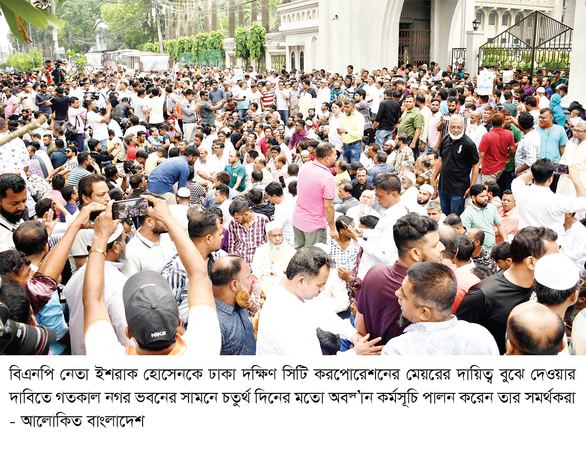 ঢাকা দক্ষিণ সিটি করপোরেশনের মেয়র পদের দায়িত্ব বুঝিয়ে দেয়ার দাবিতে বিএনপি নেতা ইশরাক হোসেনের সমর্থকেরা গতকাল রোববারও বিক্ষোভ করেছেন। ঢাকার গুলিস্তানে নগর ভবনের সামনে তাদের অবস্থান ও বিক্ষোভের কারণে ওই রাস্তায় দুই ঘণ্টা যান চলাচল বন্ধ থাকে। পরে তারা বিক্ষোভ মিছিল করেন। গতকাল রোববারও নগর ভবনের মূল ফটকসহ সব ফটকে তালা ঝুলছিল। ফলে নগর ভবনে কাজ হয়নি। নাগরিক সেবা বন্ধ রয়েছে। ‘ঢাকাবাসী’ ব্যানারে চারদিন ধরে নগর ভবনের সামনে বিক্ষোভ ও অবস্থান কর্মসূচি পালন করছেন ইশরাকের সমর্থকেরা। আজ সোমবার বেলা ১১টা থেকে বিকাল ৩টা পর্যন্ত ‘ব্লকেড’ ঘোষণা করেছেন ইশরাক সমর্থকেরা। ঢাকাবাসীর পক্ষে কর্মসূচি ঘোষণা করেন মশিউর রহমান। তিনি বলেন, নগর ভবনের কার্যক্রম আগামীকাল বন্ধ রাখার জন্য সকাল ১১টা থেকে বিকাল ৩টা পর্যন্ত আমরা এখানে অবস্থান করবো। আগামীকাল নগর ভবনে ‘ব্লকেড’ কর্মসূচি চলমান থাকবে। এসময় ইশরাক সমর্থকদের ‘দফা এক দাবি এক, আসিফের পদত্যাগ’- এমন স্লোগান দিতে দেখা যায়। এদিকে সকাল থেকেই নগর ভবনে সেবা নিতে এসে অনেকেই ফিরে যাচ্ছেন হতাশ হয়ে। কেউ এসে দীর্ঘ সময় অপেক্ষাও করছেন।