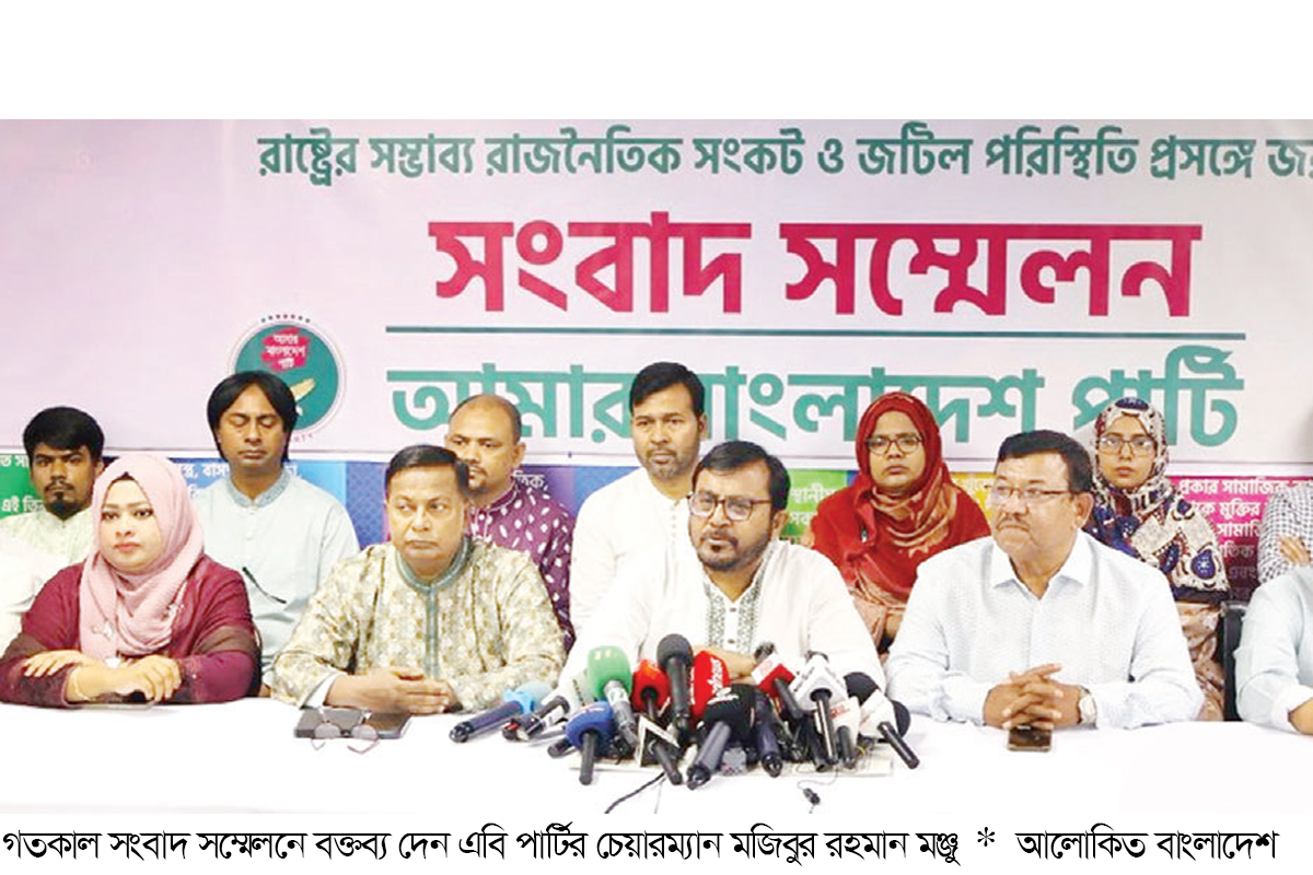 রাষ্ট্রের সম্ভাব্য রাজনৈতিক সংকট ও জটিল পরিস্থিতিতে ড. ইউনূসের পদত্যাগ নয় বরং আলাপ-আলোচনার মাধ্যমে সব পক্ষকে সমঝোতামূলক সমাধানে পৌঁছার আহ্বান জানিয়েছে আমার বাংলাদেশ পার্টি (এবি পার্টি)। গতকাল শুক্রবার বিকাল ৪টায় রাজধানীর বিজয়নগর দলের কেন্দ্রীয় কার্যালয়ে এক জরুরি সংবাদ সম্মেলন থেকে এ আহ্বান জানান দলটির চেয়ারম্যান মজিবুর রহমান মঞ্জু। অন্তর্বর্তী সরকারের প্রধান উপদেষ্টা ড. মুহাম্মদ ইউনূসের পদত্যাগের আগ্রহ প্রকাশকে কেন্দ্র করে জাতির মধ্যে যে উদ্বেগ, উৎকণ্ঠা, অনিশ্চয়তা ও জটিল পরিস্থিতি তৈরি হওয়ার শঙ্কা দেখা দিয়েছে- তার প্রেক্ষিতে এই জরুরি সংবাদ সম্মেলন ডাকা হয়। সংবাদ সম্মেলনে সিনিয়র নেতাদের মধ্যে উপস্থিত ছিলেন ভাইস চেয়ারম্যান জাহাঙ্গীর কাসেম, লে. কর্নেল (অব.) হেলাল উদ্দিন, লে. কর্নেল (অব.) দিদারুল আলম, যুগ্ম সাধারণ সম্পাদক ব্যারিস্টার নাসরিন সুলতানা মিলি, আমিনুল ইসলাম এফসিএ, শাহাদাতুল্লাহ টুটুল, সাংগঠনিক সম্পাদক (রাজশাহী) সাইয়েদ নোমান, সাংগঠনিক সম্পাদক (বরিশাল) গাজী নাসির এবং বিদ্যুৎ, জ্বালানি ও প্রযুক্তিবিষয়ক সম্পাদক ইঞ্জিনিয়ার মোহাম্মদ লোকমান। মঞ্জু বলেন, গত কয়েক মাস ধরে দেশে যে পরিস্থিতি ঘুরপাক খাচ্ছিল এবং সরকারের সঙ্গে বিভিন্ন পক্ষের যে দূরত্ব দৃশ্যমান হচ্ছিল তাতে আমরা উদ্বিগ্ন ছিলাম। আমরা বলেছিলাম এটা বন্ধ না হলে ক্রমশ জটিলতা ও সংকট দেখা দেবে।