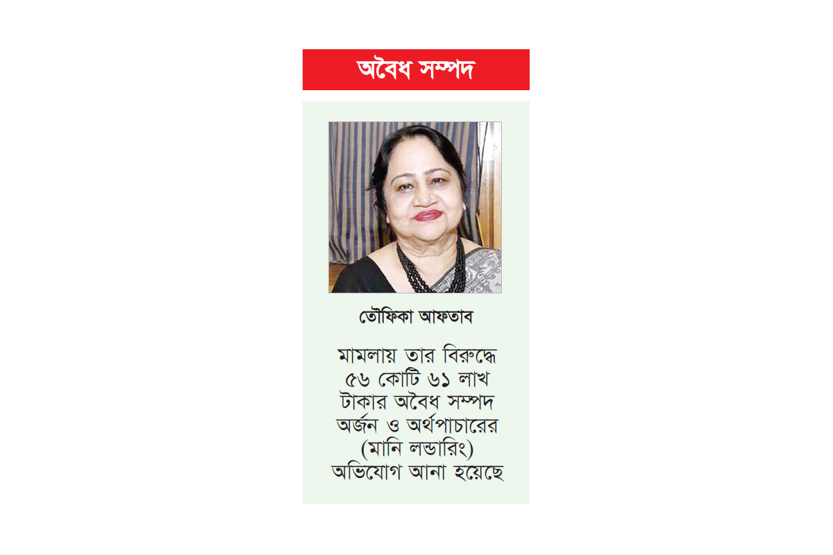 সাবেক আইনমন্ত্রী আনিসুল হকের ‘বান্ধবী’ আইনজীবী তৌফিকা আফতাব ওরফে তৌফিকা করিমের বিরুদ্ধে মামলা করেছে দুর্নীতি দমন কমিশন (দুদক)। মামলায় তার বিরুদ্ধে ৫৬ কোটি ৬১ লাখ টাকার অবৈধ সম্পদ অর্জন ও অর্থপাচারের (মানি লন্ডারিং) অভিযোগ আনা হয়েছে। পাশাপাশি তার ৮৮টি ব্যাংক হিসাবে ৩৭৪ কোটি ৫১ লাখ ৪৭ হাজার ৯৮৪ টাকার সন্দেহজনক লেনদেন করার অভিযোগ আনা হয়েছে। গতকাল রাজধানীর সেগুনবাগিচায় দুদক কার্যালয়ে সংবাদ সম্মেলনে সংস্থার উপ-পরিচালক (জনসংযোগ) আকতারুল ইসলাম বলেন, তৌফিকা করিমের বিরুদ্ধে বিপুল পরিমাণ অবৈধ সম্পদ অর্জন এবং অর্থপাচারের ‘সুস্পষ্ট প্রমাণ’ পাওয়ায় মামলা হয়েছে। তিনি বলেন, তৌফিকা করিমের নামে ৫৯ কোটি ২৩ লাখ ৬৪ হাজার টাকার সম্পদের তথ্য মিলেছে। কিন্তু বৈধ আয়ের প্রমাণ পাওয়া গেছে ২ কোটি ৬২ লাখ ৭ হাজার টাকার। এছাড়া তৌফিকা করিমের নামে থাকা ৮৮টি ব্যাংক হিসাবের মাধ্যমে ৩৭৪ কোটি ৫১ লাখ টাকার আর্থিক লেনদেনের তথ্য পাওয়া গেছে, যার মধ্যে ২০১ কোটি ৮৮ লাখ টাকা জমা এবং ১৭২ কোটি ৬২ লাখ টাকা উত্তোলন করা হয়েছে। এর আগে গত ২৩ এপ্রিল তৌফিকা করিমের ৩৭ ব্যাংক হিসাবে থাকা ৪৩ কোটি ৬৬ লাখ ৬৬ হাজার ১৬০ টাকা অবরুদ্ধের আদেশ দেন আদালত। এছাড়া গত ৬ ফেব্রুয়ারি তার দেশত্যাগে নিষেধাজ্ঞাও আসে।