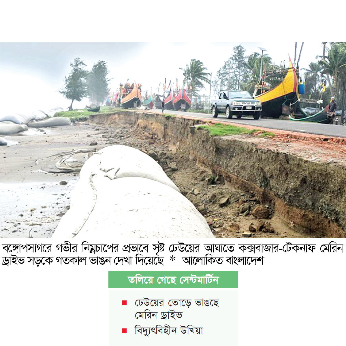 ঢেউয়ের তোড়ে ভাঙছে মেরিন ড্রাইভ : সাগরে নিম্নচাপের প্রভাবে দুদিনের ভারি বৃষ্টি ও জোয়ারের পানির তোড়ে কক্সবাজার টেকনাফ মেরিন ড্রাইভ সড়কে ভাঙন দেখা দিয়েছে। স্থানীয়রা জানায়, ঢেউের আঘাতে মেরিন ড্রাইভের বাহারছড়া ঘাট, টেকনাফ সদর ইউনিয়নের নাফ ট্যুরিজম পার্ক এলাকার আনুমানিক ১০০ মিটারের উপরে ভেঙে গেছে। সেখানে থাকা কয়েকটা ঝাউগাছও ভেঙে পড়ছে। দ্রুত ভাঙন ঠেকানো না গেলে সড়কটি সাগরে তলিয়ে যোগাযোগ বিচ্ছিন্ন হওয়ার আশঙ্কা তৈরি হতে পারে।