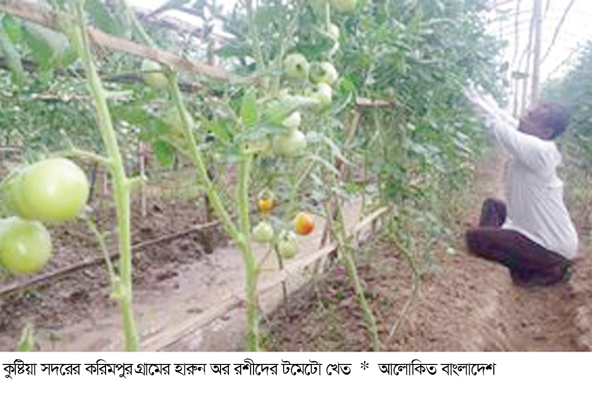 কুষ্টিয়া সদর উপজেলার উজানগ্রাম ইউনিয়নের করিমপুর গ্রামের মাঠের পিচঢালা রাস্তার পাশেই পলিথিনের শেড দিয়ে ঢাকা হারুন অর রশীদের দৃষ্টিনন্দন টমেটো ক্ষেত। মানুষ সমান উঁচু সারিবদ্ধ টমেটো গাছের গোড়া থেকে আগা পর্যন্ত থোকা থোকা টমেটো শোভা পাচ্ছে। অনেকেই শখের বসে টমেটো ক্ষেত দেখতে এসছেন। ওই ক্ষেতে দাঁড়িয়ে কথা হয় সফল টমেটো চাষী হারুন অর রশীদের সঙ্গে। তিনি জানান, নিজের কোন আবদি জমি নেই তার। তিনি বরাবর অন্যের জমি বর্গা নিয়ে চাষাবাদ করে সংসার চালান। কৃষি বিভাগের পরামর্শে ২০২৩ সালে ৫ শতাংশ জমি বর্গা নিয়ে প্রথম গ্রীষ্মকালিন টমেটো চাষ করে তিনি সফলতার মুখ দেখেন। পরের বছর তিনি প্রায় ২০ শতাংশ জমিতে এই সবজি আবাদ করেন। এবার ২০২৫ সালে তিনি ১ বিঘা জমি বর্গা নিয়ে টমেটো চাষ করেছেন।