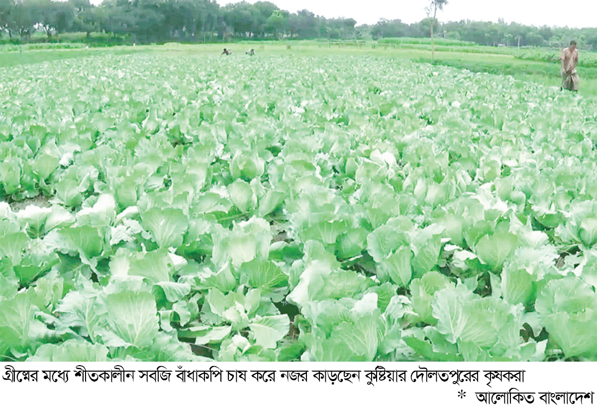 গ্রীষ্মের মধ্যে শীতকালীন সবজি বাঁধাকপি চাষ করে নজর কাড়ছেন কুষ্টিয়ার দৌলতপুরের কৃষকরা। দৌলতপুর সীমান্তের আদাবাড়িয়া ইউনিয়নের ধর্মদহ গ্রামের কৃষকরা বাঁধাকপির ভালো ফলন পেয়েছেন। স্থানীয় চাহিদা পূরণ করে বাঁধাকপি এখন সরবরাহ হচ্ছে রাজধানী ঢাকা ছাড়াও দেশের বিভিন্ন জেলায়। কৃষকরা জানান, বর্তমানে প্রতি বিঘা জমিতে বাঁধাকপি বিক্রি করে প্রায় ৩০-৩৫ হাজার টাকা পর্যন্ত লাভ হচ্ছে। কেউ কেউ তাদের ফসল ৮০ হাজার থেকে ১ লাখ টাকা পর্যন্ত বিক্রি করেছেন। তবে সাম্প্রতিক সময়ে বাজারমূল্য কিছুটা কমে যাওয়ায় হতাশায় ভুগছেন অনেকে। অনেকে বাঁধাকপি প্রস্তুত রেখেছেন, বাজারমূল্য বাড়ার অপেক্ষা করছেন। কৃষকরা জানান, গত বছরের তুলনায় চলতি মৌসুমে বীজ, সার ও দিনমজুরের খরচ বেড়ে গেছে। ফলে প্রতি বিঘা জমিতে বাঁধাকপি চাষে খরচ হয়েছে ৩০-৩৫ হাজার টাকা। উপজেলার ধর্মদহ গ্রামের কৃষক ওবাইদুল ইসলাম জানান, তিনি এবার ১২ বিঘা জমিতে বাঁধাকপি চাষ করেছেন। তার হিসাব অনুযায়ী প্রতি বিঘায় ৩০-৩৫ হাজার টাকা খরচ হয়েছে এবং তিনি আশা করছেন সমপরিমাণ লাভ হবে। একই গ্রামের চাষি আজাদ হোসেন জানান, তিনি ৩৬ শতাংশ জমিতে বাঁধাকপি চাষ করেছিলেন। খরচ হয়েছিল ৩০ হাজার টাকা এবং বিক্রি করেছেন ৮৫ হাজার টাকা। অন্যদিকে লালন হোসেন জানান, দেড় বিঘা জমির কপি ১ লাখ ৬০ হাজার টাকায় বিক্রি করলেও বৈরী আবহাওয়ায় বাজারদর কমে যাওয়ায় কিছু ব্যবসায়ী পুরো টাকা দিতে গড়িমসি করছেন। এদিকে ব্যবসায়ীরা জানান, ঢাকায় বাঁধাকপি নিয়ে যেতে পরিবহন খরচই পড়ছে ৩০-৪০ হাজার টাকা। বর্তমানে পাইকারি বাজারে প্রতি পিস বাঁধাকপি বিক্রি হচ্ছে মাত্র ৩০ টাকায়, ফলে লাভের পরিমাণ কমে গেছে। এ বিষয়ে ইউনিয়নের উপসহকারী কৃষি কর্মকর্তা কাইউম মিলন বলেন, ‘মাঠপর্যায়ে কৃষকদের আমরা নিয়মিত পরামর্শ ও সহায়তা দিয়ে যাচ্ছি।’ উপজেলা কৃষি কর্মকর্তা মো. নূরুল ইসলাম বলেন, ‘এ বছর দৌলতপুর উপজেলায় ৭০ হেক্টর জমিতে গ্রীষ্মকালীন বাঁধাকপি চাষ হয়েছে। কৃষকদের চাষে উদ্বুদ্ধ করা, পরামর্শ ও প্রয়োজনীয় সহযোগিতা দেওয়া হচ্ছে।’ তিনি আরও জানান, প্রতিবছরই দৌলতপুরে গ্রীষ্মকালীন সবজি চাষের পরিমাণ বাড়ছে, ফলে কৃষকরা লাভবান হচ্ছেন এবং স্থানীয় অর্থনীতিতেও ইতিবাচক প্রভাব পড়ছে।