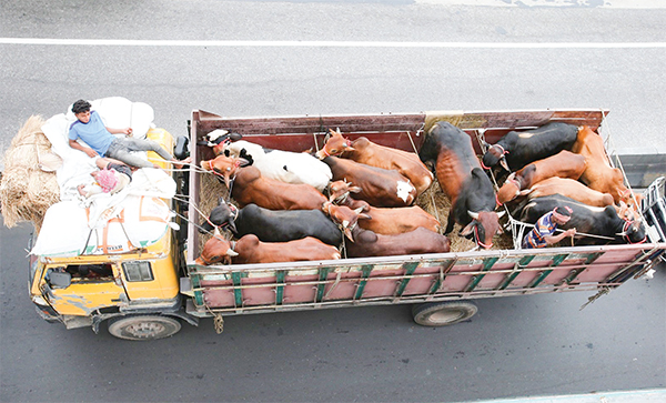 কোরবানির ঈদকে সামনে রেখে দেশের বিভিন্ন জায়গা থেকে সড়কপথে ট্রাকে করে গরু আসছে ঢাকার হাটগুলোতে। ছবিটি গতকাল যাত্রাবাড়ী থেকে তোলা * আলোকিত বাংলাদেশ