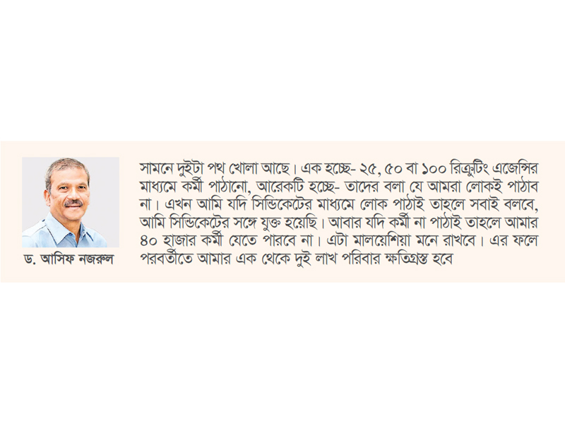 গতকাল বুধবার আন্তর্জাতিক মাতৃভাষা ইন্সটিটিউটে প্রবাসী কল্যাণ ও বৈদেশিক কর্মসংস্থান মন্ত্রণালয় আয়োজিত ‘জাপানের শ্রম বাজার: সম্ভাবনা ও চ্যালেঞ্জ’ শীর্ষক এক সেমিনারে উপদেষ্টা এসব কথা বলেন। উপদেষ্টা আসিফ নজরুল আরও বলেন, ‘মালয়েশিয়ার সঙ্গে আগের সরকার চুক্তি করে রেখেছে যে, তোমরা রিক্রুটিং এজেন্সির তালিকা দেবে, আমরা নির্ধারণ করব। এটা দুই পক্ষের আনুষ্ঠানিক চুক্তি। যেটাকে আমরা সিন্ডিকেট বলি। এখন আমরা যখন দায়িত্ব নিয়েছি, তখন আমাদের সবাই বলছে সিন্ডিকেট করা যাবে না। আর সিন্ডিকেট না করতে হলে চুক্তি পরিবর্তন করতে হবে। সেটা তো মালয়েশিয়া সরকারকে পিটিয়ে করতে পারব না। এখন তার সঙ্গে আমাদের সমঝোতা করতে হবে। যদি সে চুক্তি পরিবর্তন না করে, তাহলে আমার সামনে দুইটা পথ খোলা আছে। এক হচ্ছে- তার কথা অনুযায়ী ২৫, ৫০ বা ১০০ রিক্রুটিং এজেন্সির মাধ্যমে পাঠানো, আরেকটি হচ্ছে- তাদের বলা যে আমরা লোকই পাঠাব না। এখন আমি যদি সিন্ডিকেটের মাধ্যমে লোক পাঠাই তাহলে সবাই বলবে আমি সিন্ডিকেটের সঙ্গে যুক্ত হয়েছি। আবার যদি কর্মী না পাঠাই তাহলে আমার ৪০ হাজার কর্মী যেতে পারবে না। এটা মালয়েশিয়া মনে রাখবে। এর ফলে পরবর্তীতে আমার এক থেকে দুই লাখ পরিবার ক্ষতিগ্রস্ত হবে।’